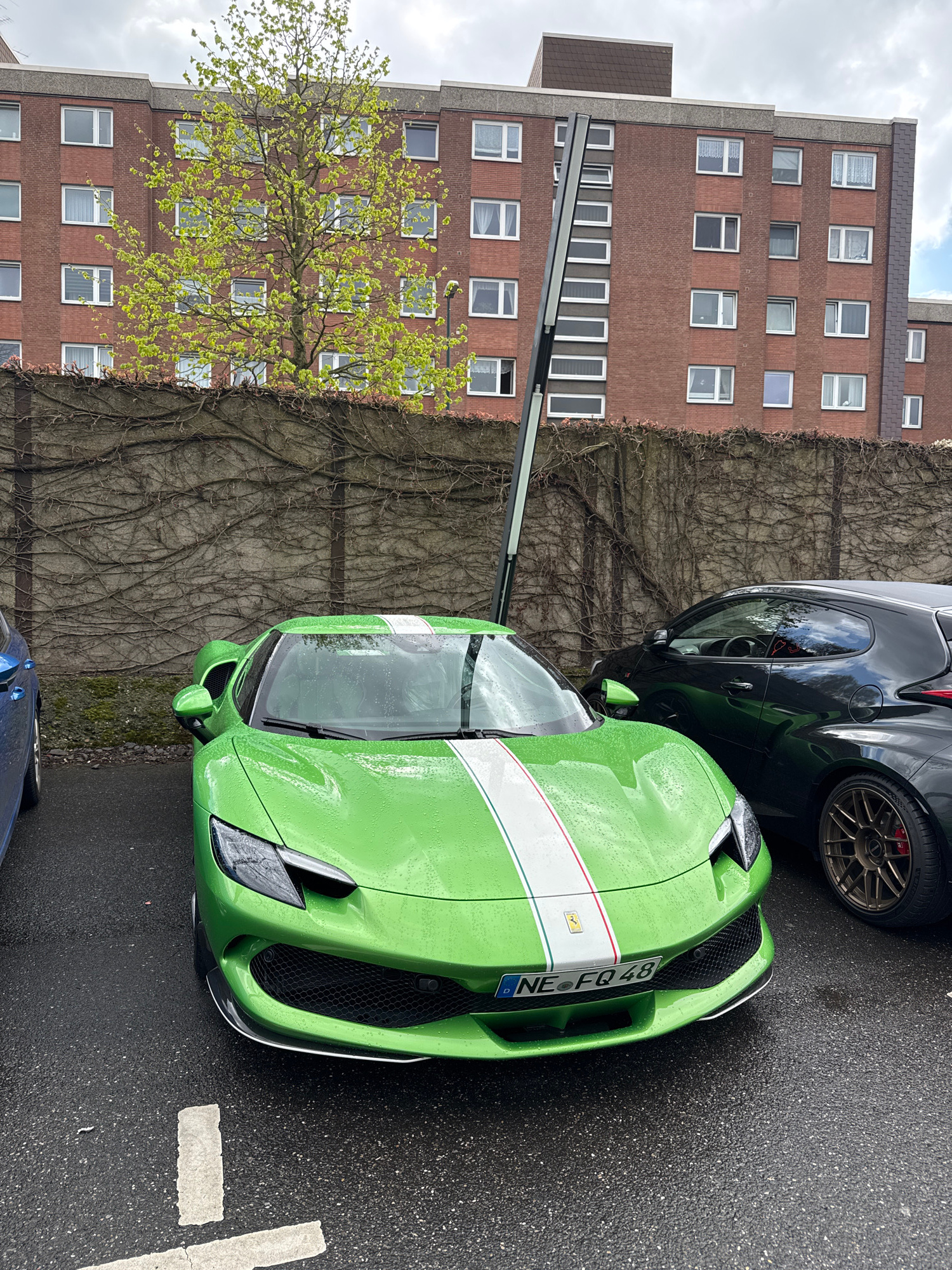 The image shows a green Ferrari 296 GTB with a white and blue stripe parked on a wet asphalt parking lot. The car has a German license plate "NE-FQ 48". Part of a black car is visible next to it. In t…read more