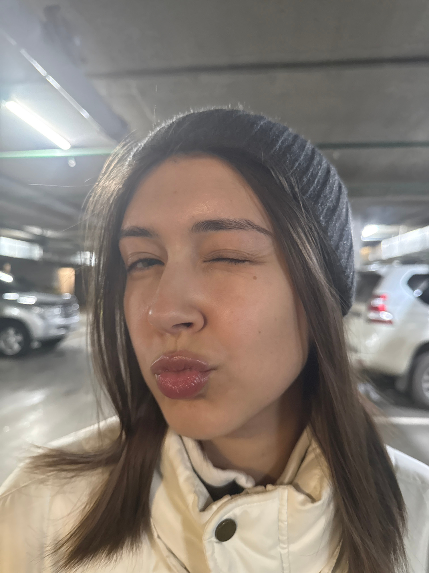 A woman with brown hair and a gray beanie is puckering her lips. She is wearing a light-colored jacket. The background appears to be a parking garage, with a car visible and fluorescent lighting. The…read more