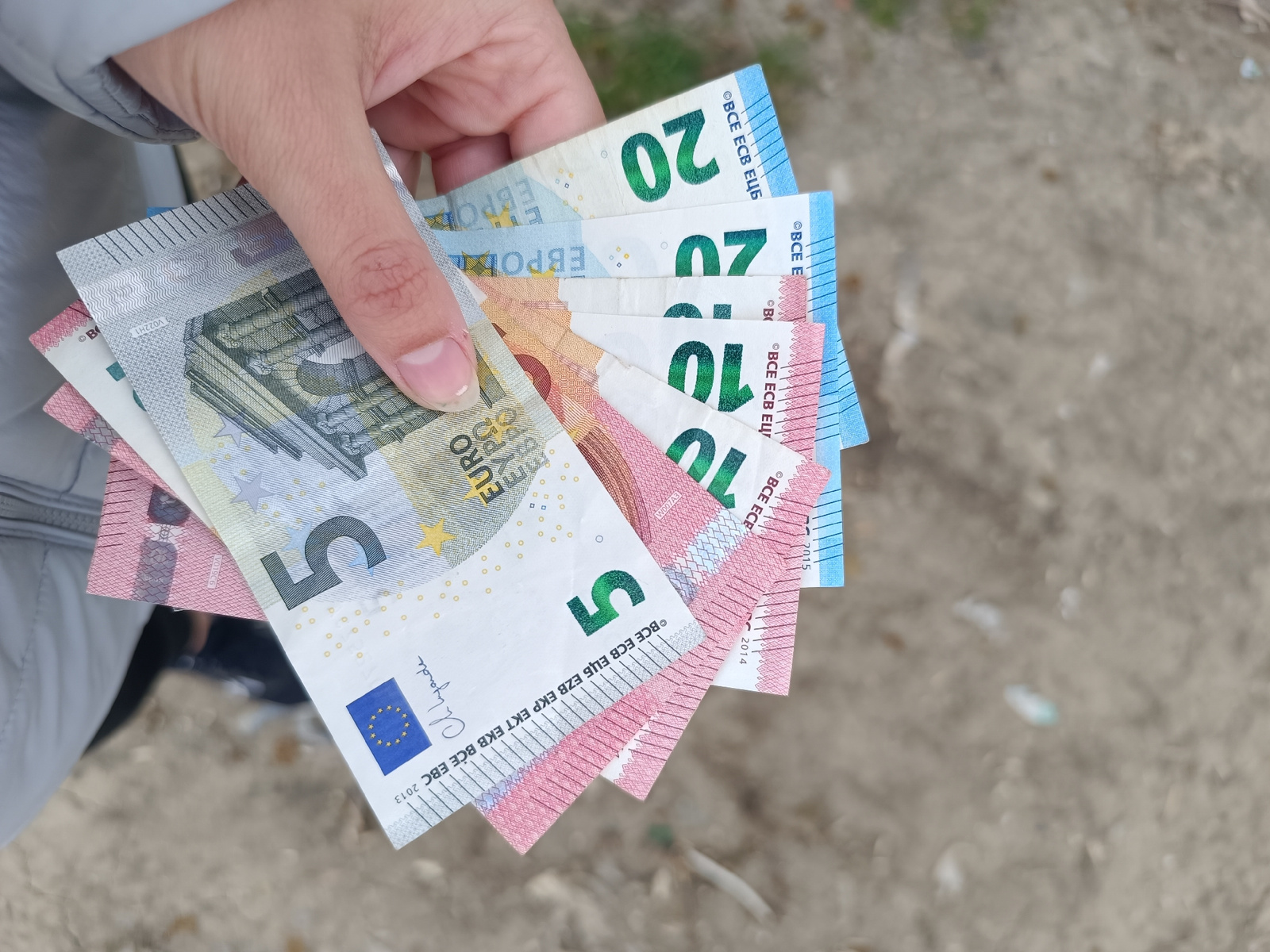 A person is holding several euro banknotes in their hand. The banknotes include a 5 euro note, a 10 euro note and a 20 euro note. The background is blurred. There is no information that the location i…read more