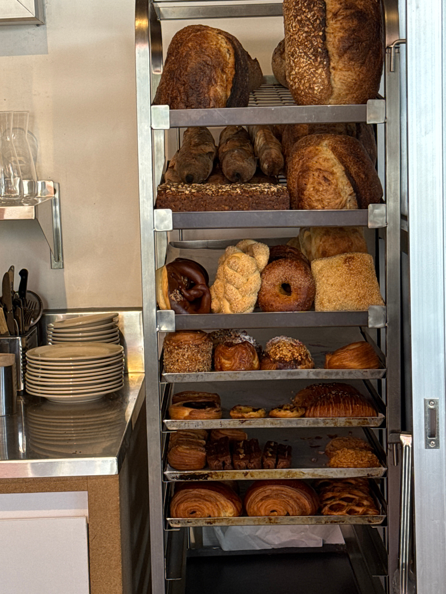 The image shows a display case of baked goods, likely in a bakery or cafe. The case is made of metal and has multiple compartments. The baked goods include various types of bread, bagels, croissants,…read more