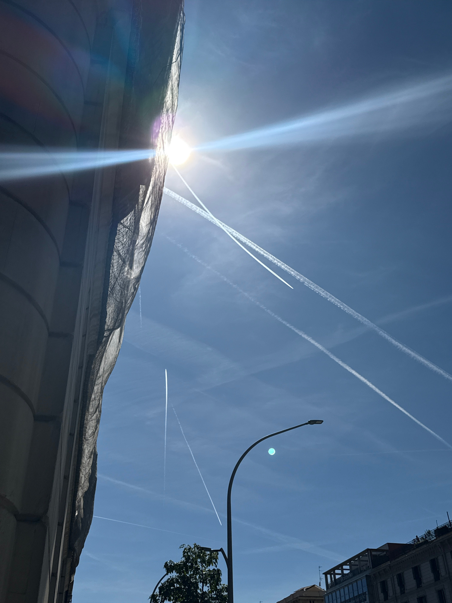 The image shows a view looking up towards a bright, daytime sky in Barcelona, Spain. The sky is blue with multiple contrails from airplanes crisscrossing the frame. Part of a building is visible at thβ¦read more