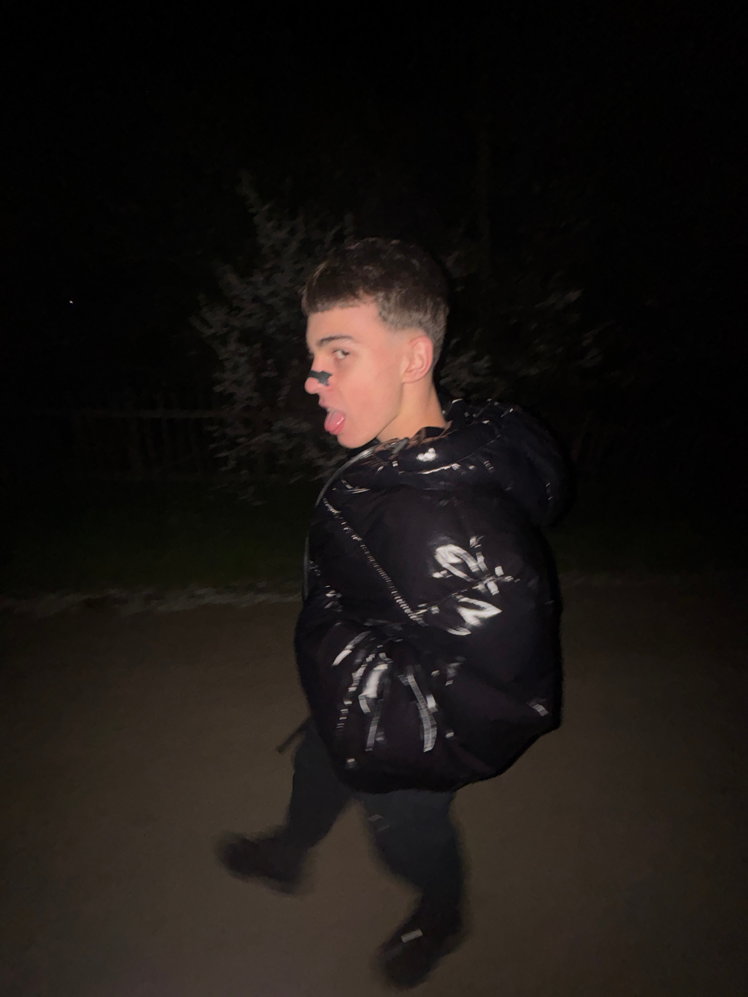 A young man stands on a paved surface outdoors at night. He wears a dark, glossy puffer jacket and dark pants. The background is dark, with some vegetation visible on the left and a wall on the right.…read more