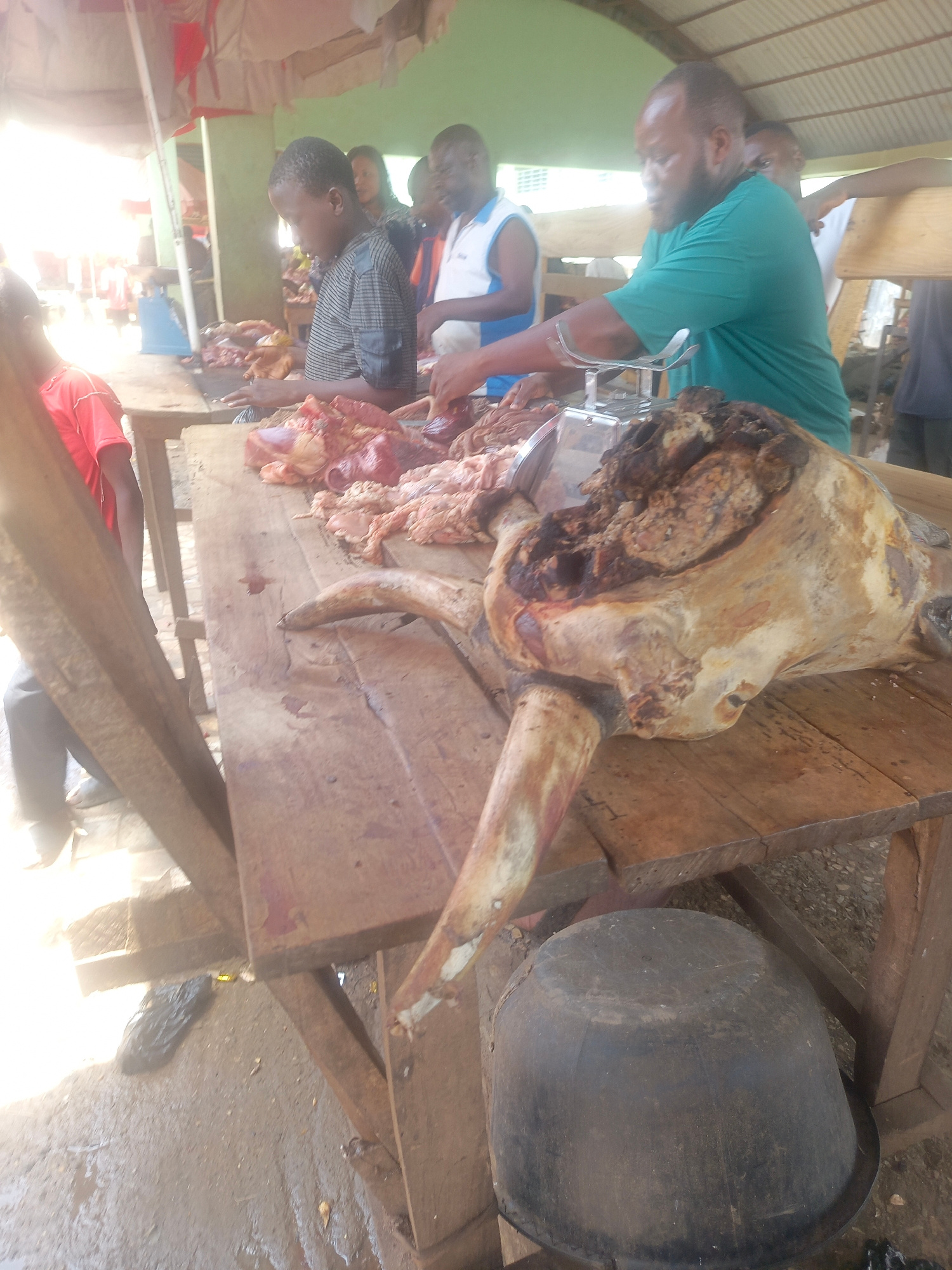 This image shows a butcher stand in Akwanga, Nigeria. On a wooden table, a large butchered animal head with one horn remaining is prominent. Various cuts of raw meat are displayed on the same table. S…read more