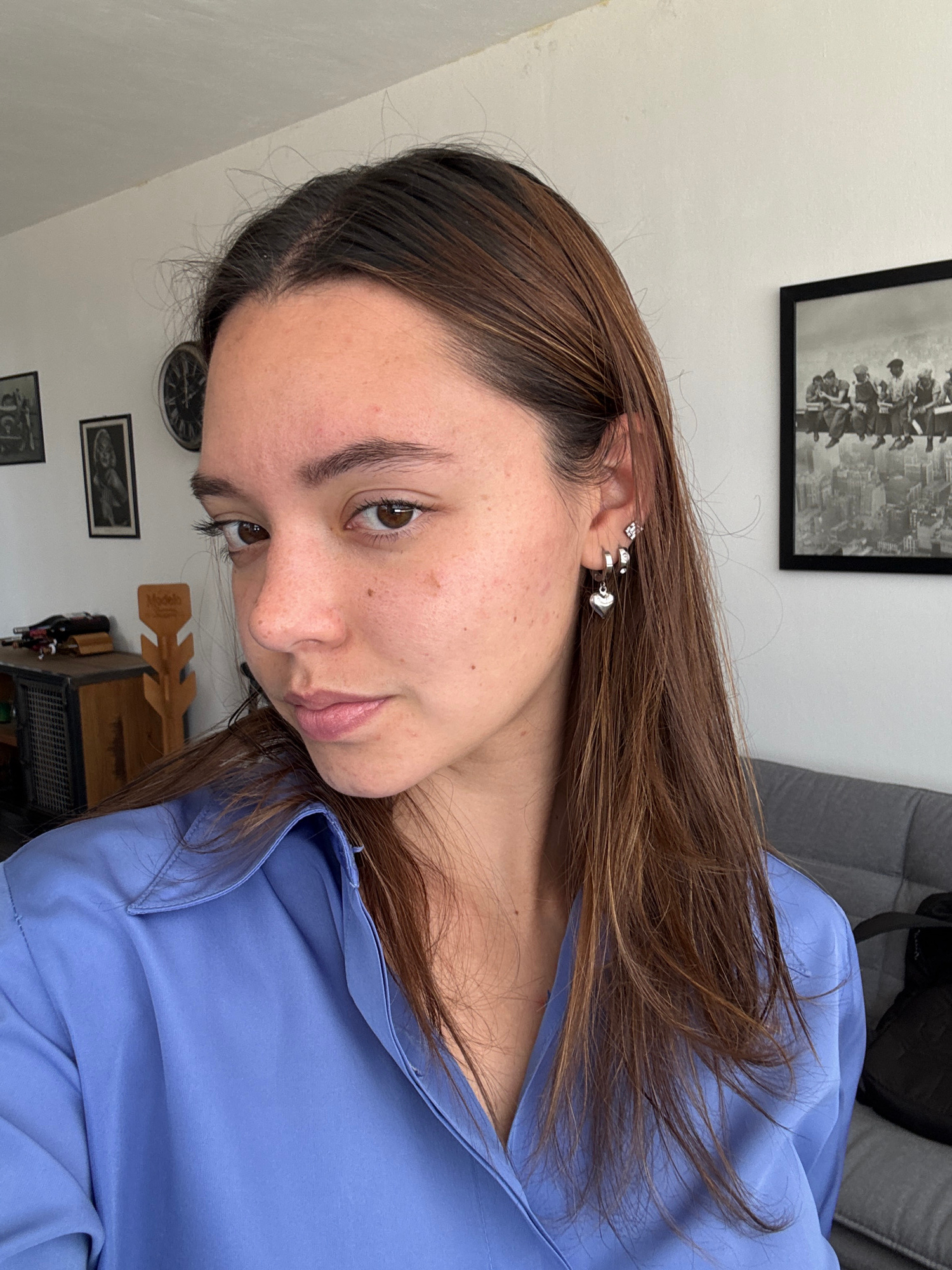A young woman with medium-length brown hair is posing for a selfie. She is wearing a light blue collared shirt. Her skin has some freckles and minor blemishes. She has several silver earrings in her l…read more