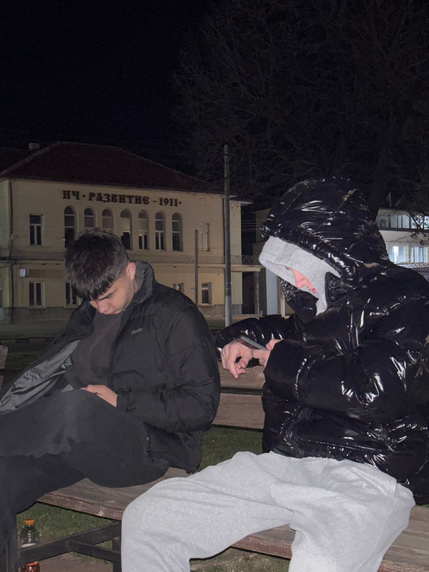 Two people are on a bench outside a building in Lehchevo, Bulgaria. The building has a sign in Cyrillic reading "НЧ. РАЗВИТИЕ-1911.". One person is wearing a shiny black hooded jacket, grey pants, and…read more