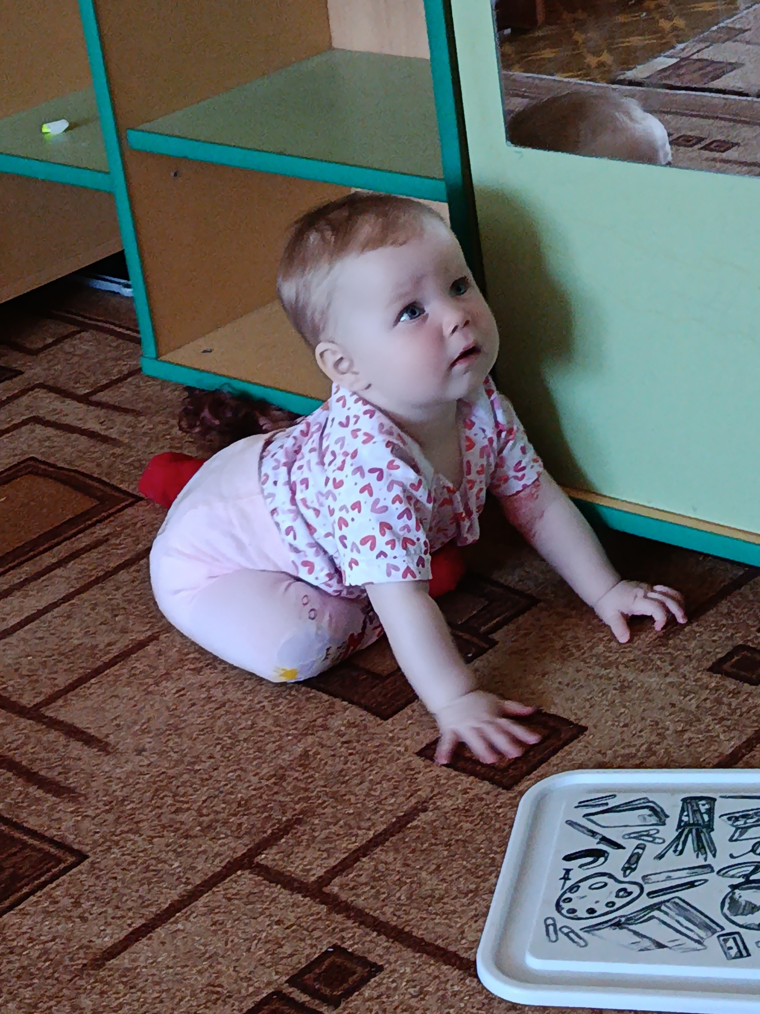An eye-level shot captures a fair-skinned baby, likely a toddler, with light red hair and blue-grey eyes, seated on a patterned brown carpet. The baby wears a white short-sleeved top with red heart pa…read more