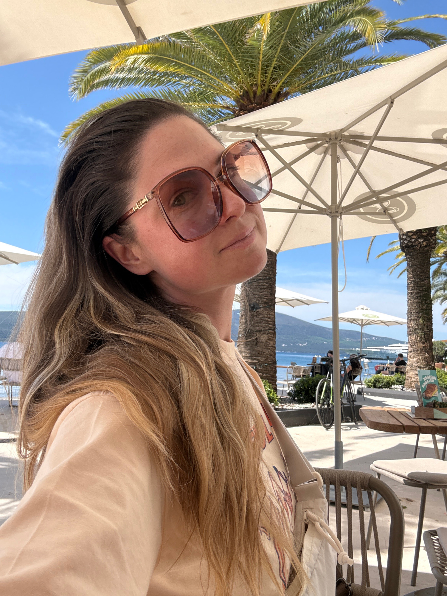 A sideways, close-up selfie shows a woman with long blonde hair wearing brown sunglasses. She is seated at an outdoor cafe in Tivat, Montenegro, as indicated by the clear blue sky, palm trees, and vie…read more