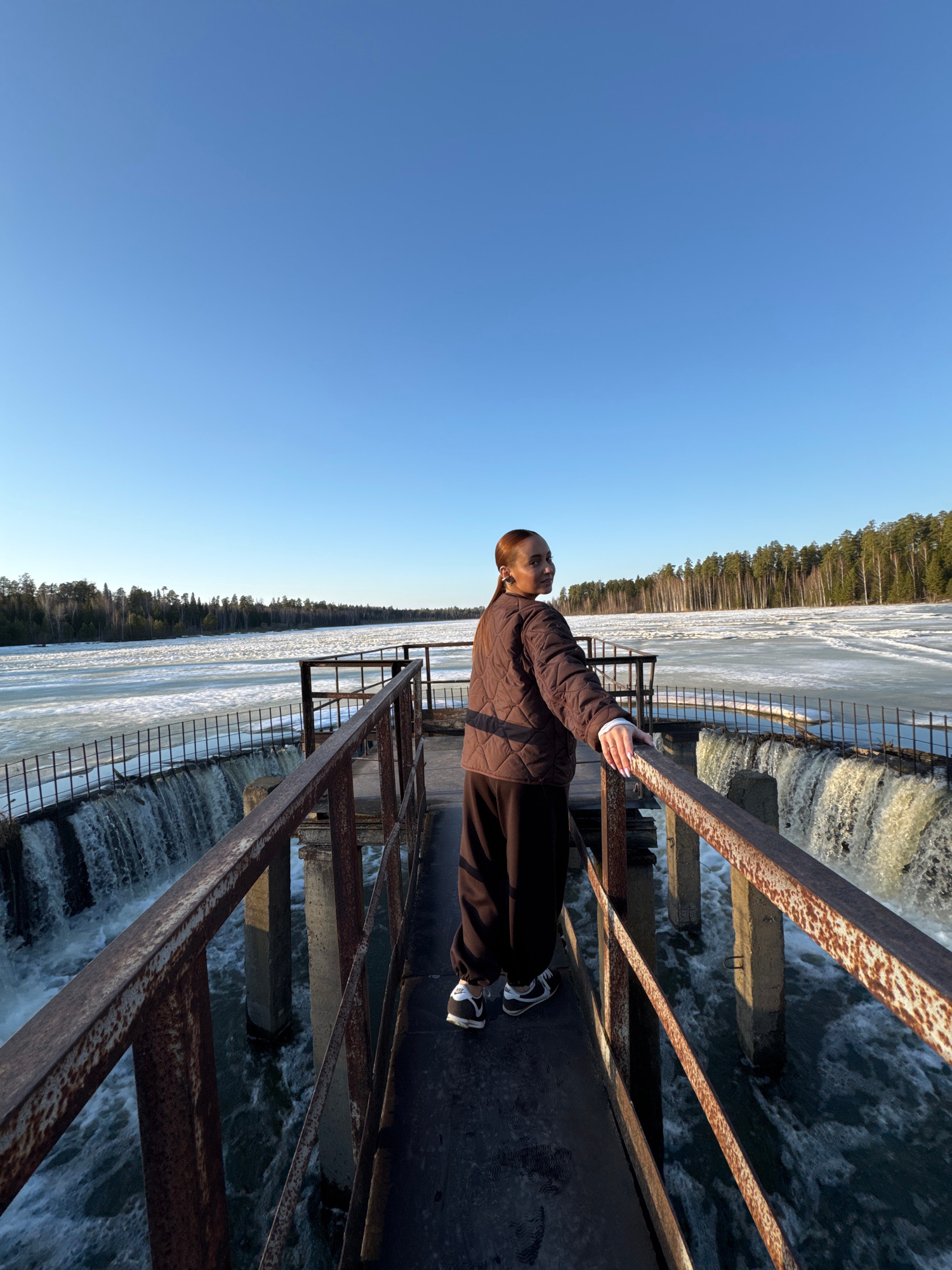 A person stands on a metal platform overlooking a body of water, possibly a river or dam, located near a forest. The person is wearing a brown jacket and dark pants with athletic shoes. They are holdi…read more