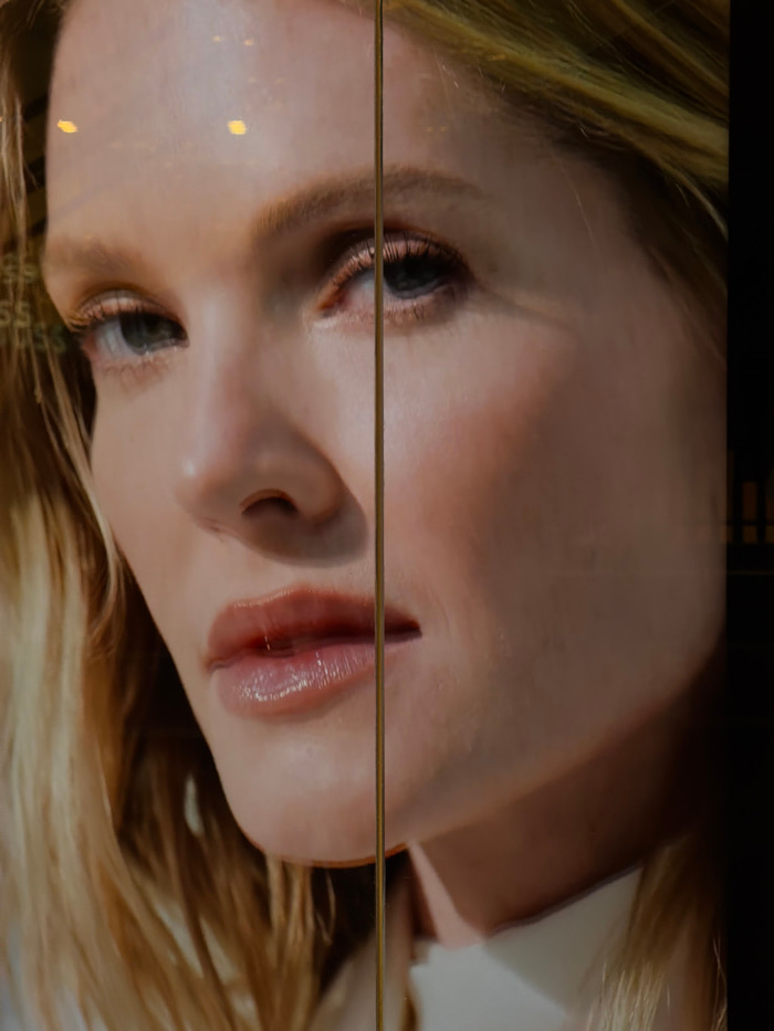 The image displays a close-up, high-resolution portrait of a fair-skinned woman, likely a model, presented on a display screen or behind glass. A prominent vertical, metallic-gold colored bar or frame…read more