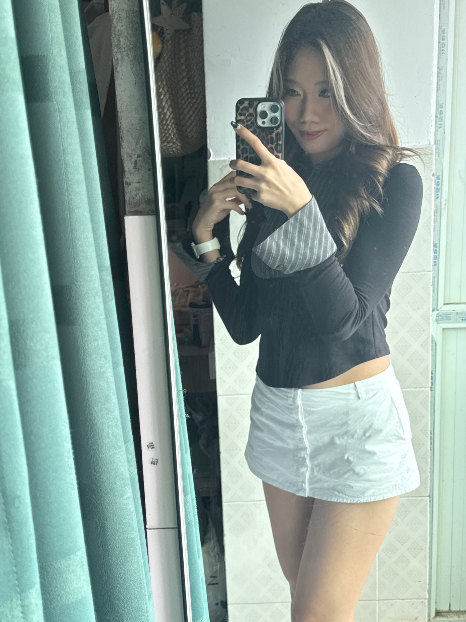 A young woman takes a mirror selfie. She holds a phone with a leopard print case and wears a black top with striped sleeves and a white skirt. The background consists of a tiled wall. The foreground s…read more
