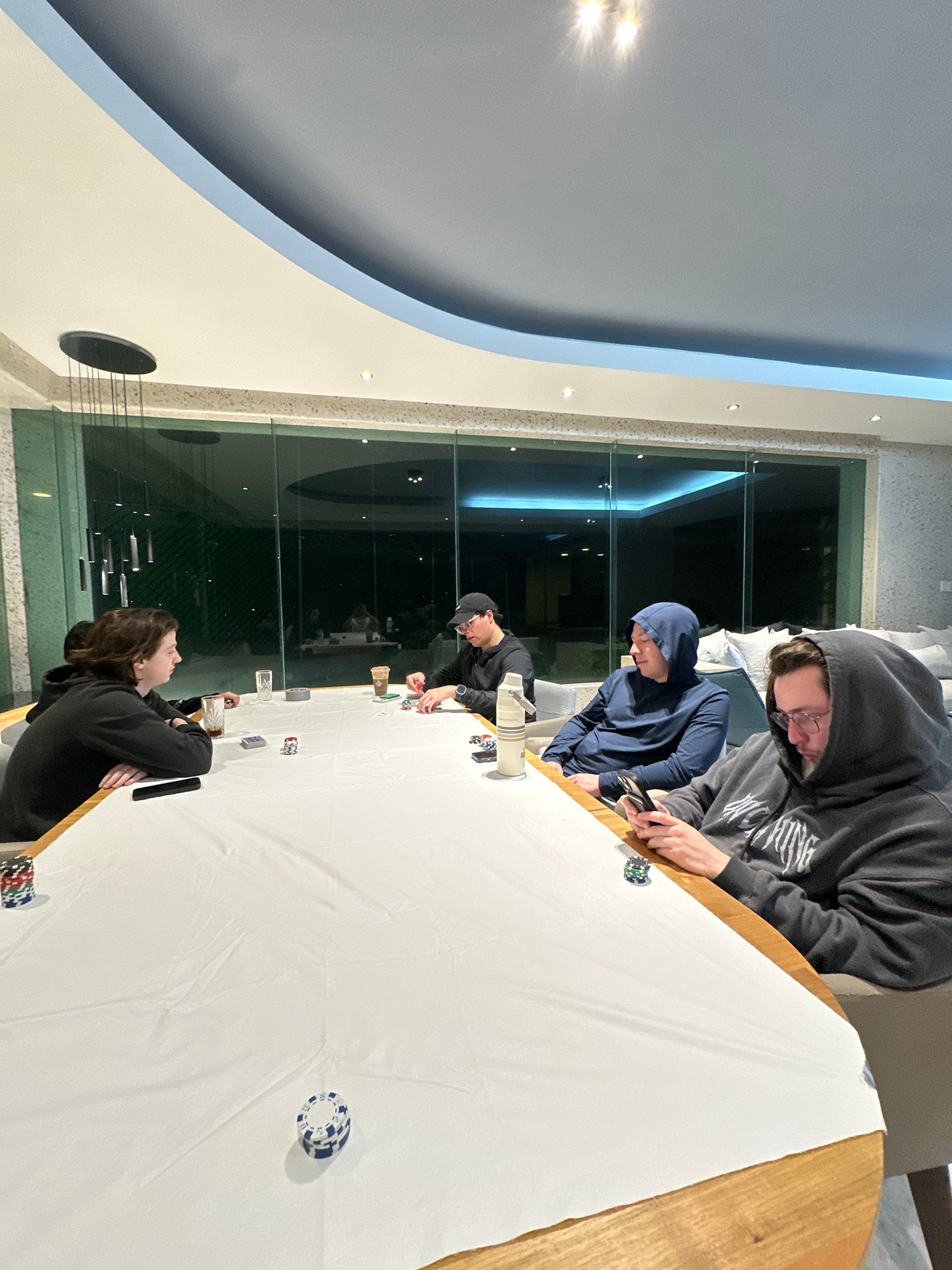Four individuals are sitting around a large, oblong table covered with a white cloth, with scattered poker chips and glasses. The table has a light wood edge. The individuals appear to be engaged in a…read more