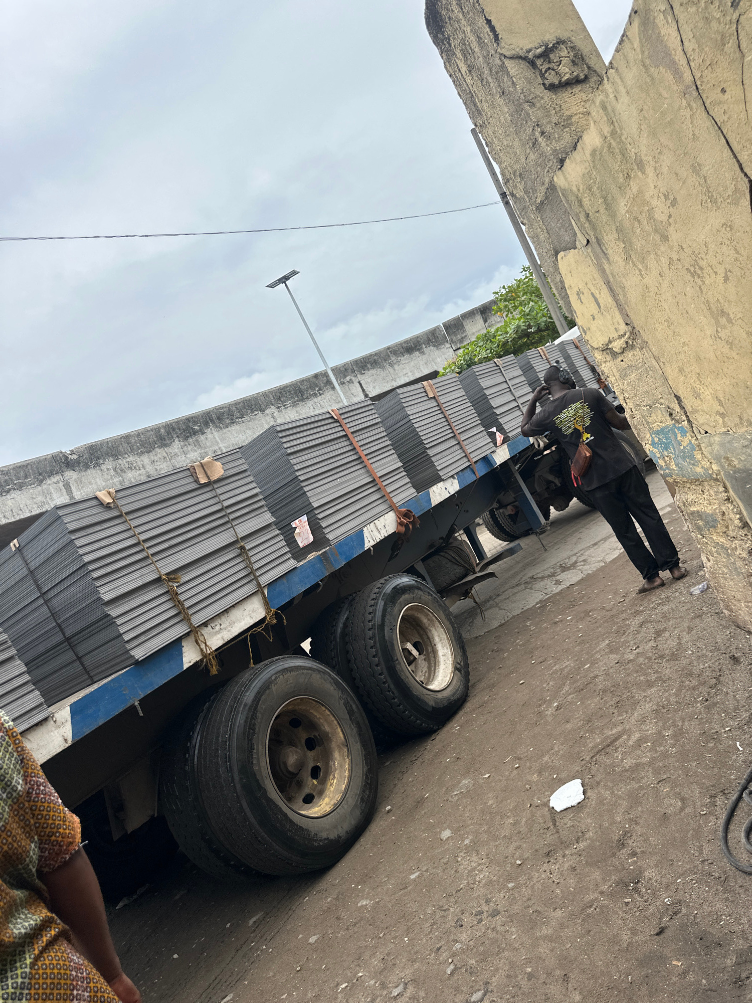 This media file, rotated clockwise, captures an outdoor scene in Agani, Nigeria, focusing on a truck loaded with construction materials under an overcast sky. **Subjects:** A prominent subject is a m…read more