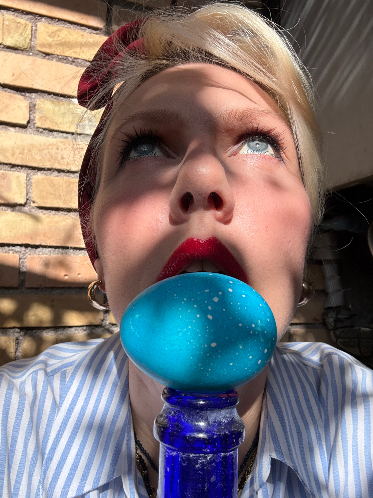 A woman is photographed with a blue, speckled egg and a blue glass bottle. The woman has blonde hair, blue eyes, and wears red lipstick. She has a red headband, gold hoop earrings, and a blue and whit…read more