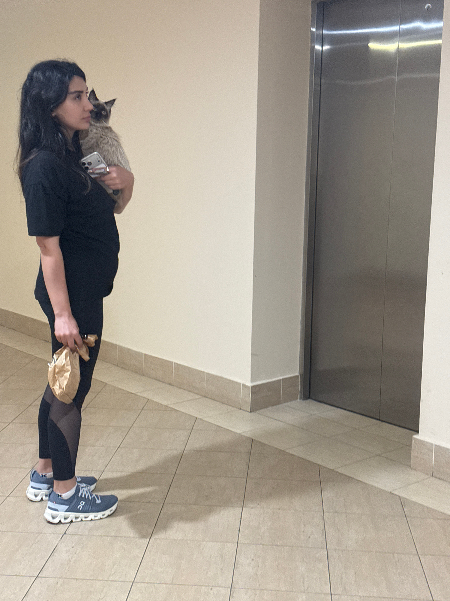 A woman is standing in what appears to be the interior of a building in Dubai, United Arab Emirates. She is holding a Siamese cat and a small paper bag. The woman has long, dark hair and is wearing a…read more