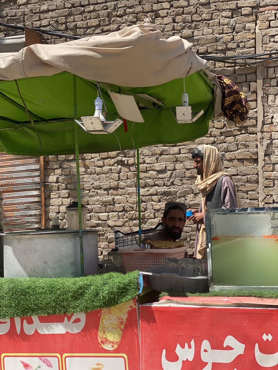 The image shows a street scene in Kandahar, Afghanistan. A juice stand is set up with a green and tan awning overhead. Two men are present: one stands at the side of the stand, wearing a head covering…read more