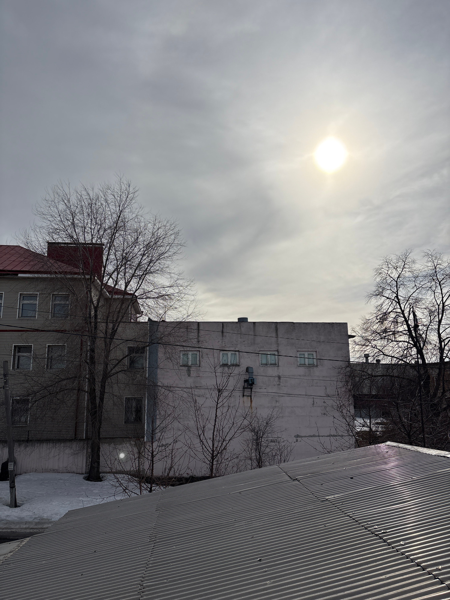The image depicts an urban landscape in Ulyanovsk, Russia, under an overcast sky with a visible sun. In the foreground, a grey corrugated metal roof slopes upwards from left to right. Beyond the roof,…read more