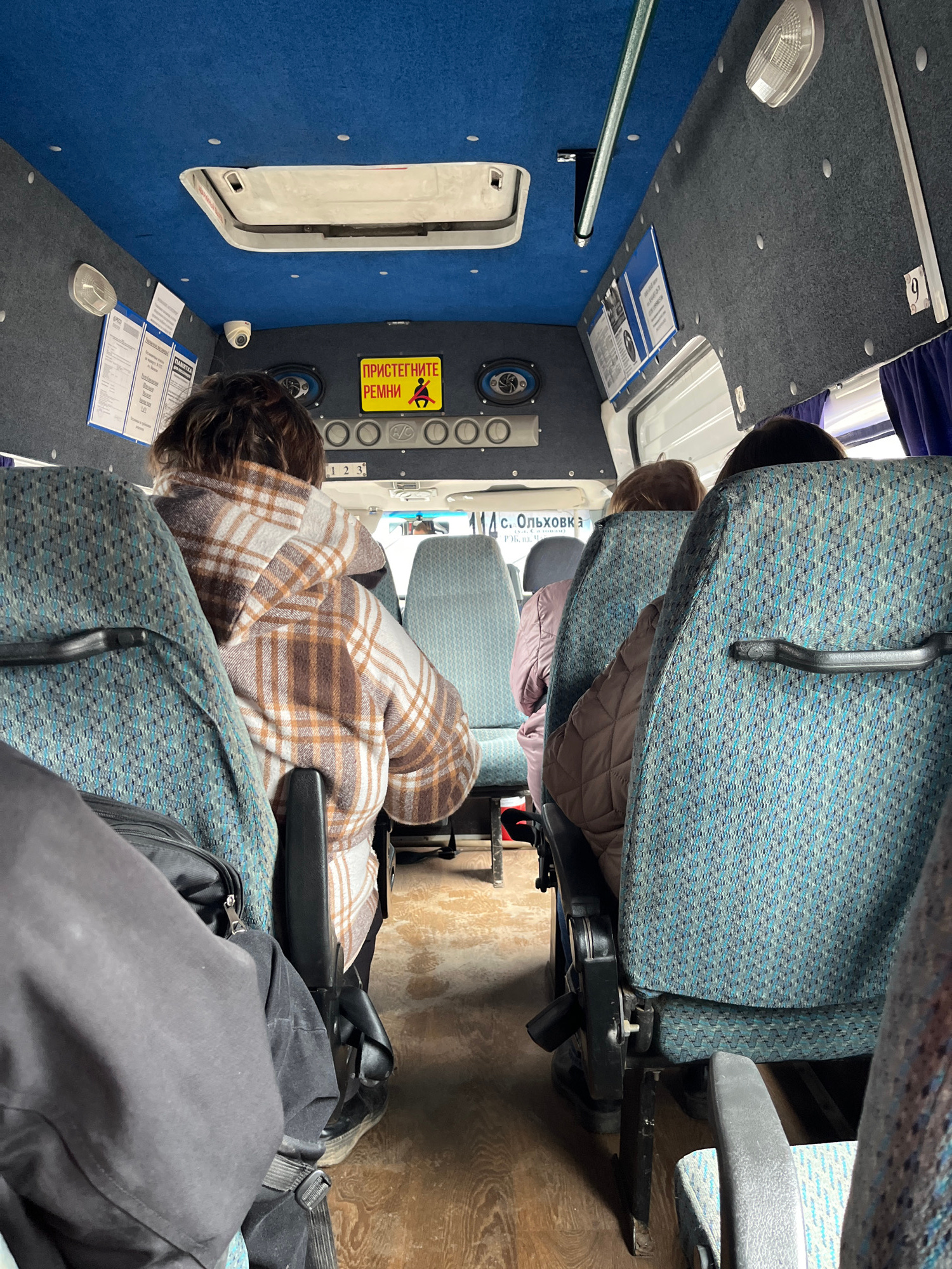The interior of a passenger vehicle, possibly a van or small bus, is shown. Two passengers are visible. One passenger is draped in a brown and white plaid blanket. The vehicle appears to be in motion,…read more