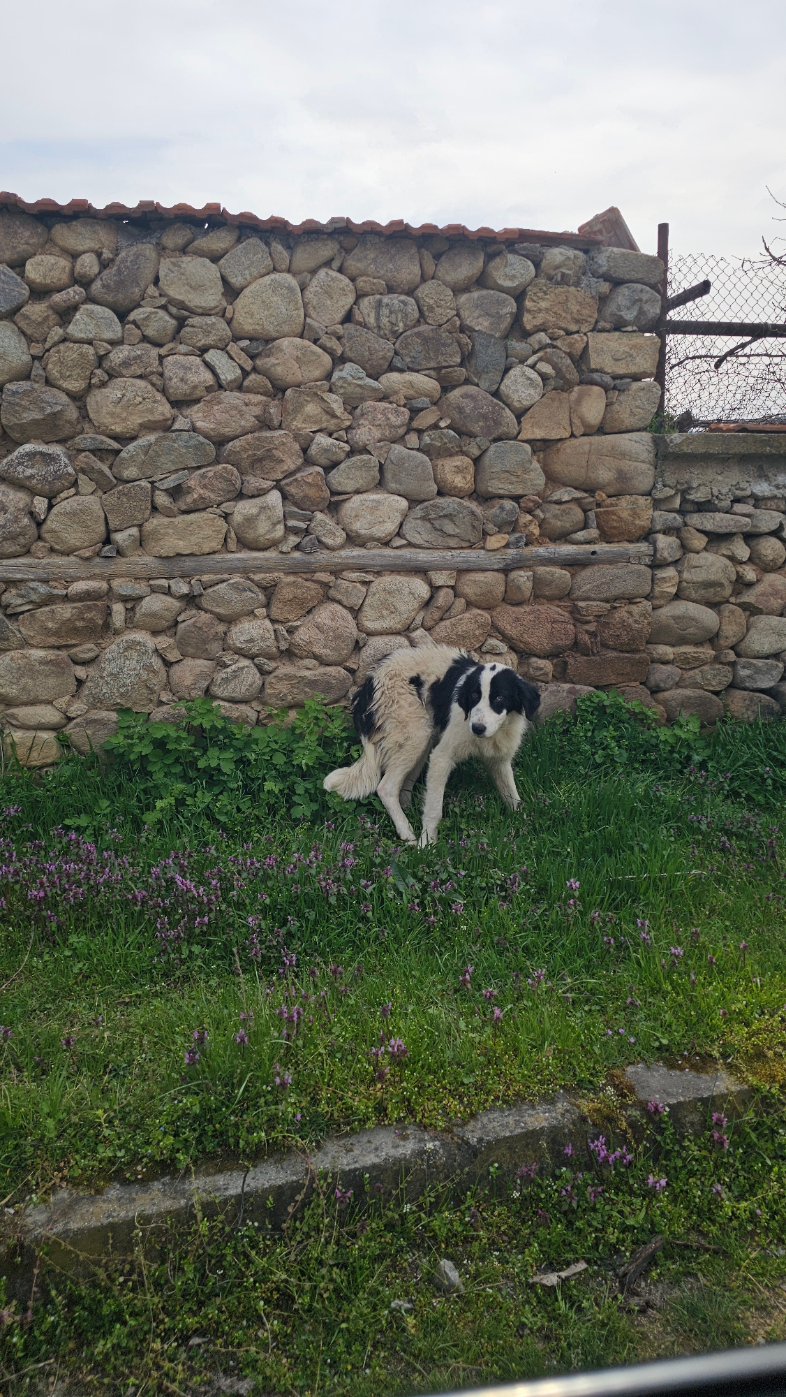 A black and white dog rests on green grass speckled with small purple flowers, adjacent to a stone wall in Slatina, Bulgaria. The wall is constructed of irregular, rounded stones and has a weathered w…read more