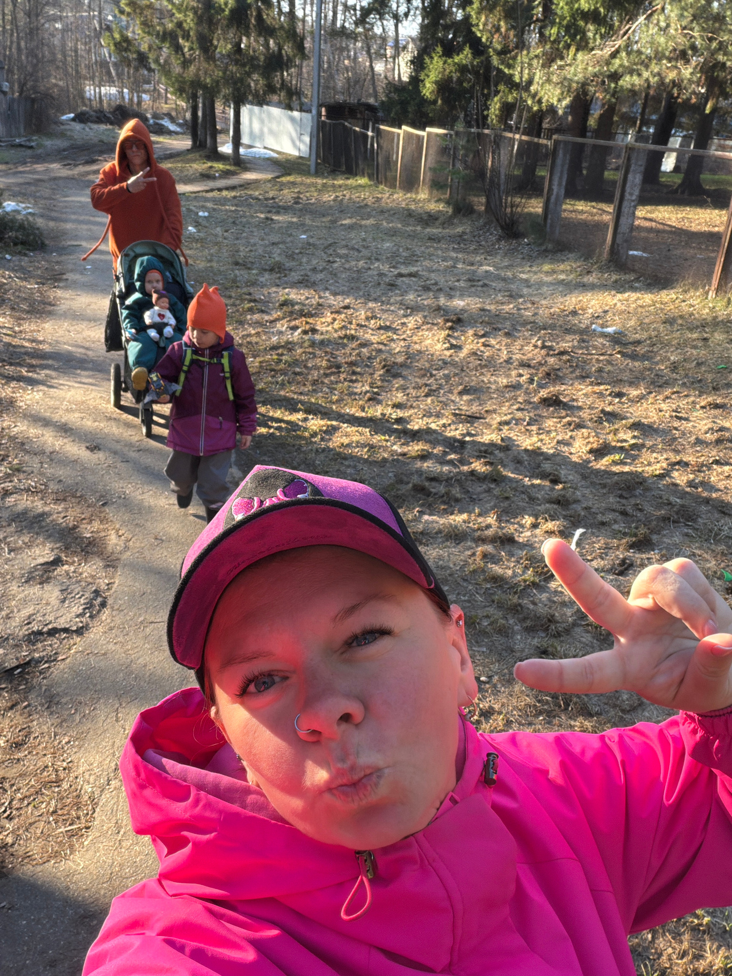 A selfie taken outdoors captures a young person in a pink jacket and purple cap making a peace sign, looking directly at the camera with blue eyes and a nose ring. The light catches their face, creatiβ¦read more