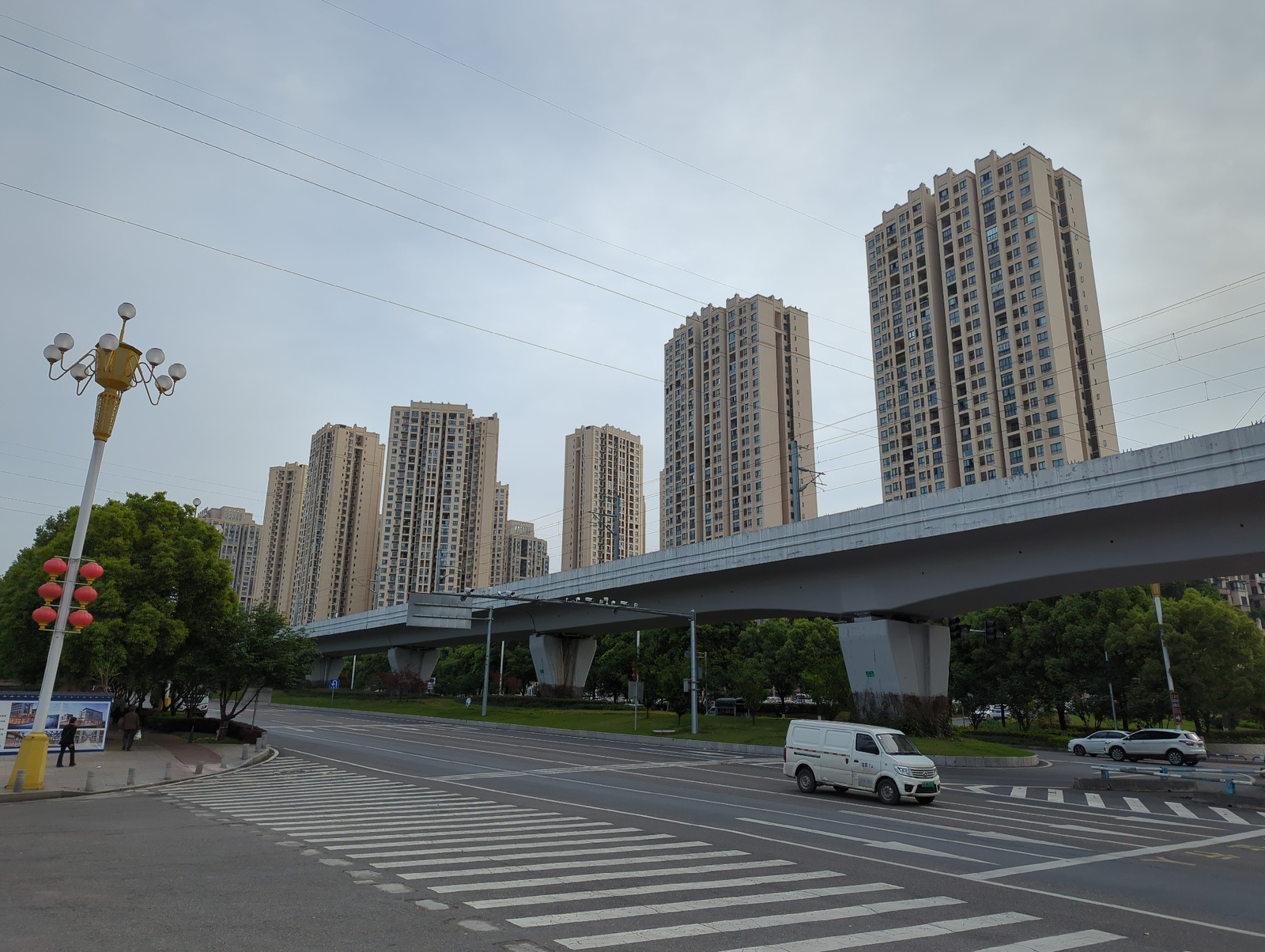 This wide-angle urban scene captures a street in Jiangjin, China, on an overcast day. The sky is a uniform light grey, with numerous overhead power lines traversing the frame. The dominant subjects a…read more