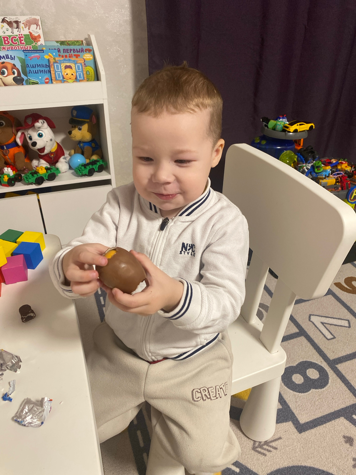 A young child is sitting at a white table. He is wearing a white zip-up jacket and light-colored pants with the word "CREATE" on the leg. He is holding a chocolate egg in his hands and appears to be o…read more