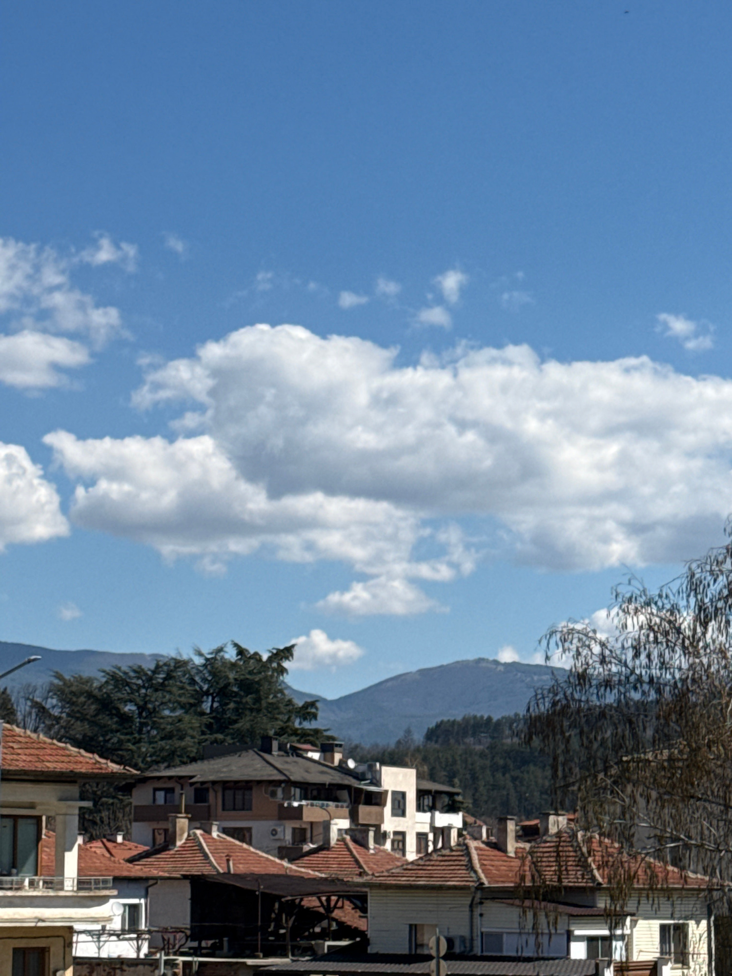 The image shows a view in Kazanlak, Bulgaria. A mountain is visible in the background. In the foreground are buildings with orange-tiled roofs, indicative of traditional Bulgarian architecture. A lush…read more