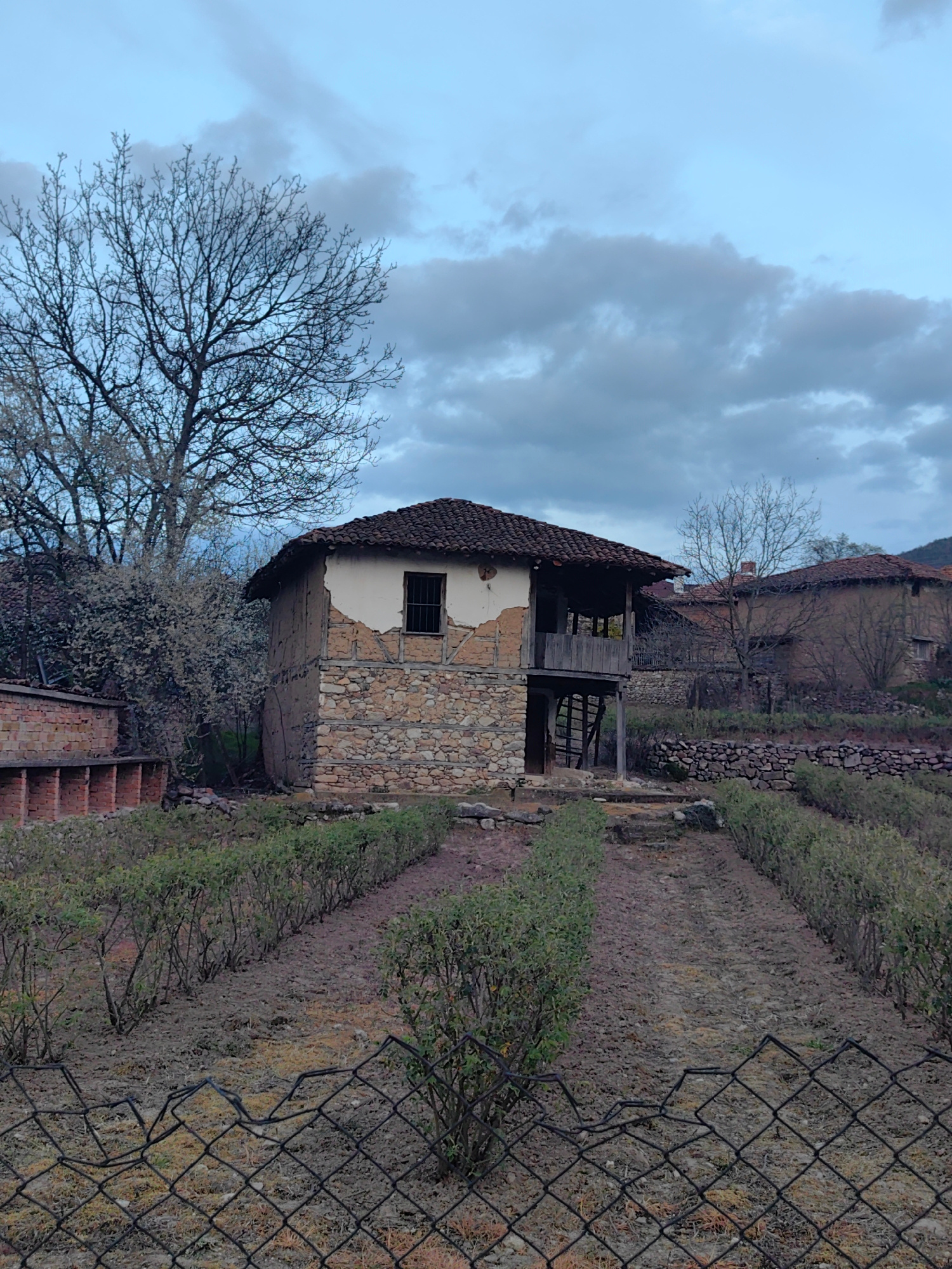 The image depicts a weathered two-story building with a tile roof, constructed of stone and stucco. The building features a wooden balcony on the second floor and a barred window. Adjacent to the buil…read more