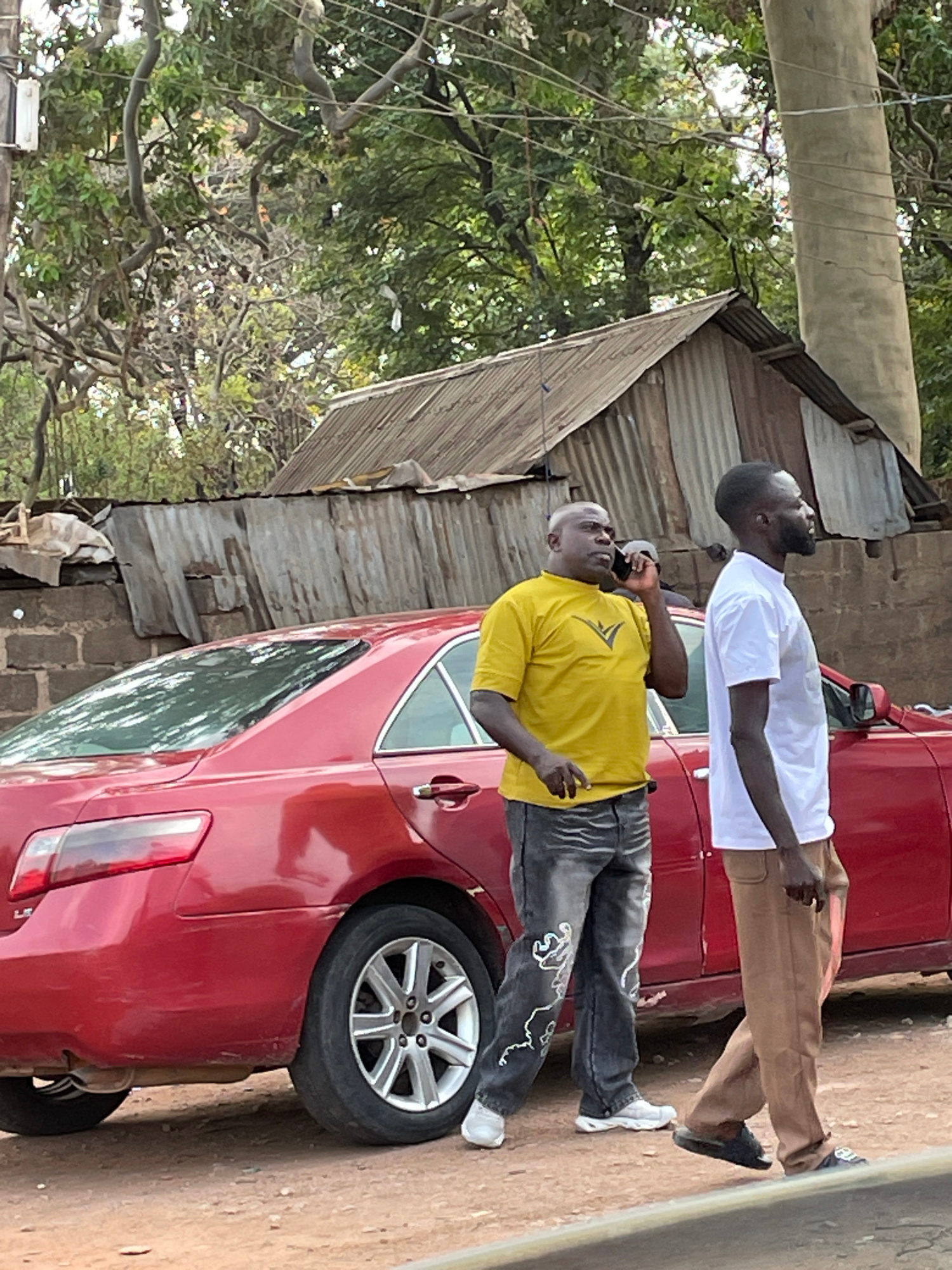 The image shows a street scene in Barakin Lerawi, Nigeria. Two men stand next to a red car. The man closest to the camera wears a yellow shirt and gray jeans with white embellishments and is talking o…read more