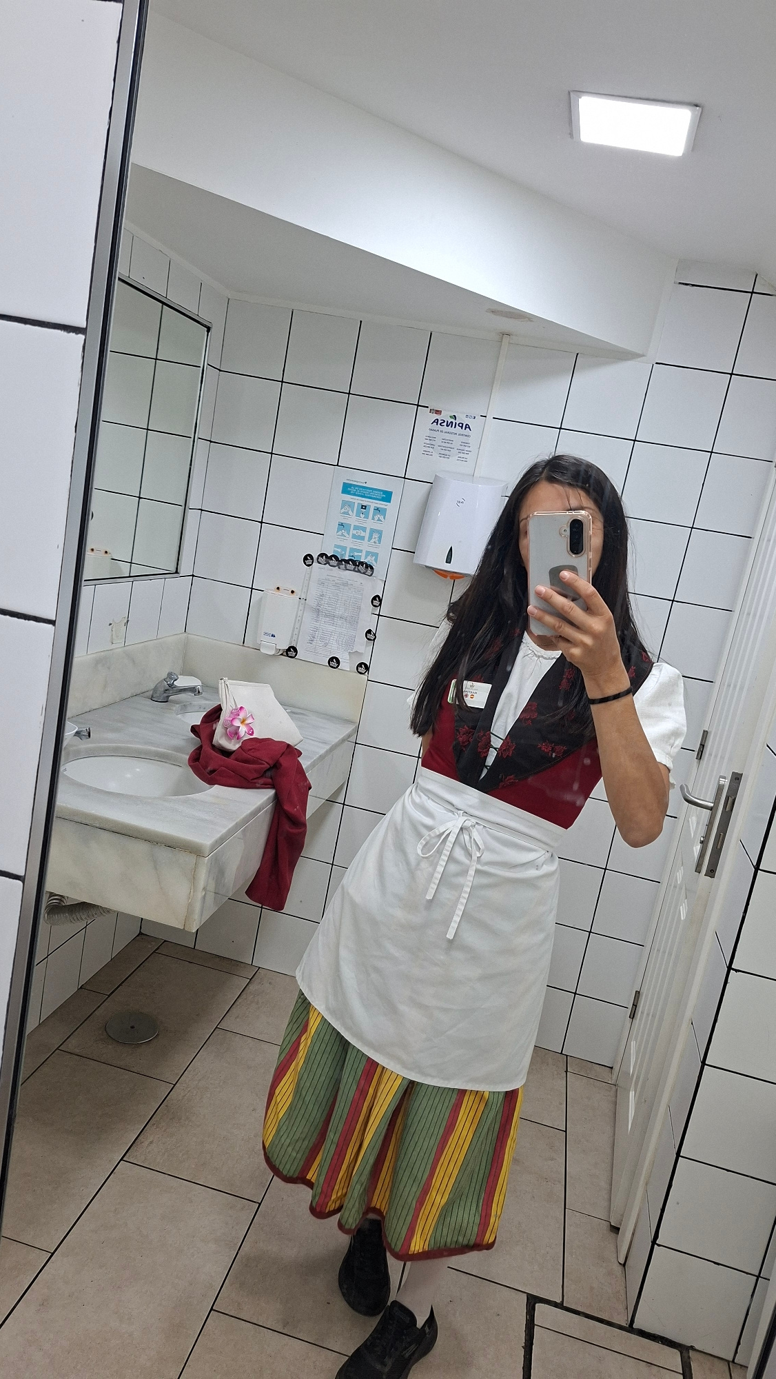 A person is taking a mirror selfie in a tiled bathroom or restroom. The person is wearing what appears to be a traditional or folkloric dress consisting of a white blouse, a red and black patterned bo…read more
