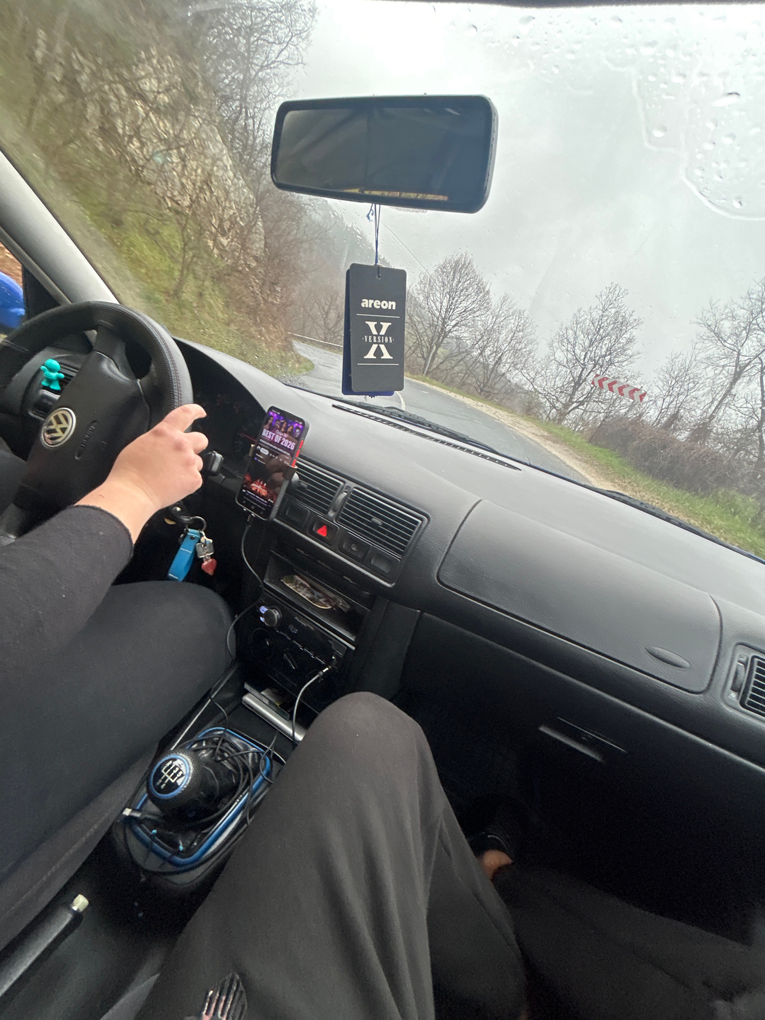 The scene is a view from inside a car, likely the driver's perspective. The windshield is wet, suggesting rain. A rearview mirror and an "Areon X" air freshener are hanging from the top of the windshi…read more