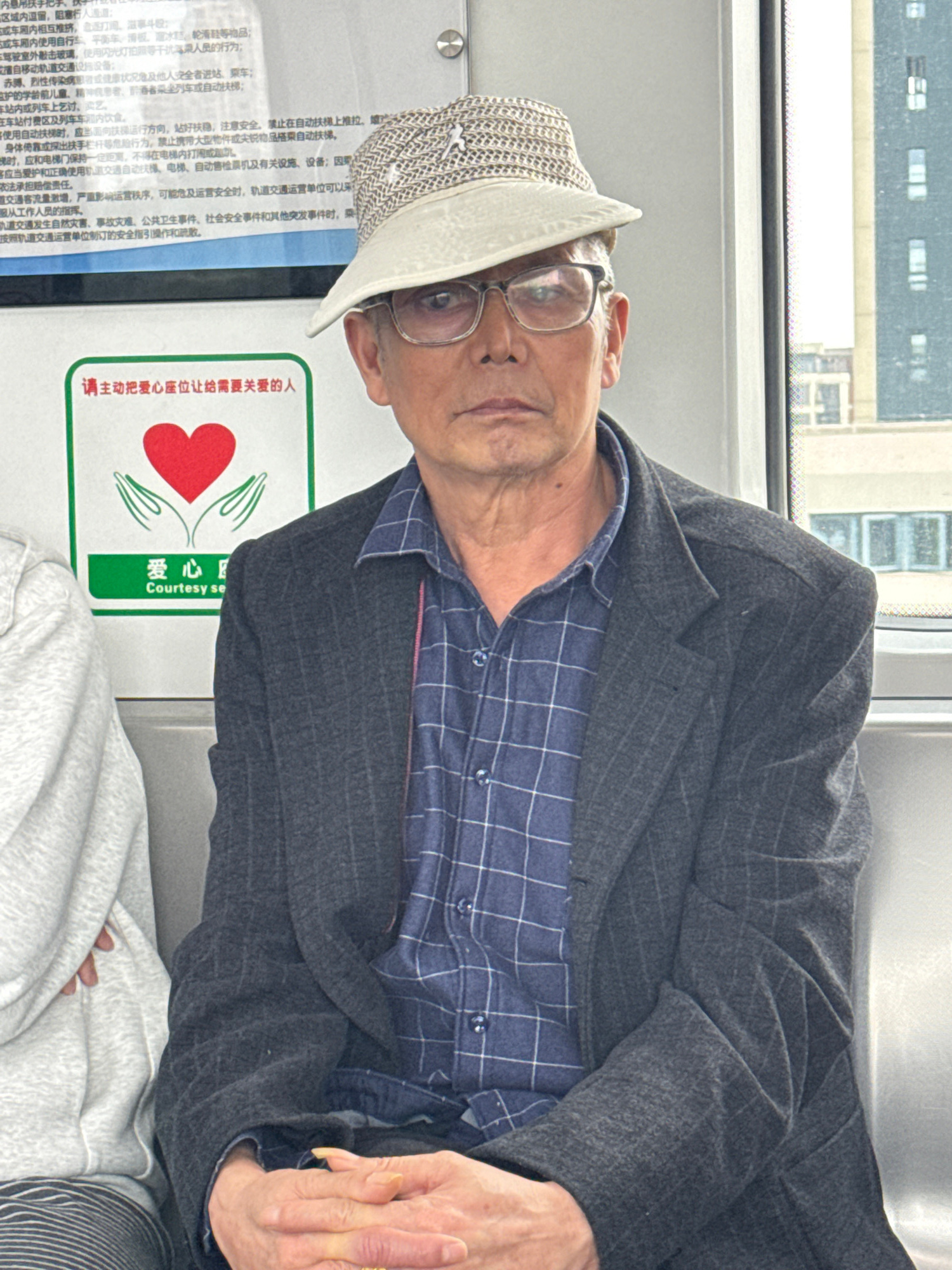 The image shows an elderly man with glasses and a hat, sitting inside what appears to be a train or subway car in Shuangfu, China. He is wearing a blue plaid shirt and a grey blazer. The man's hands a…read more