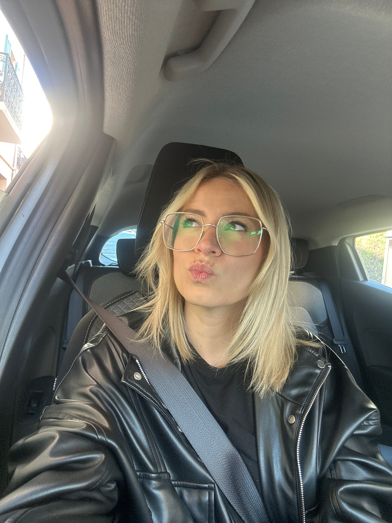 A woman with blonde hair and glasses is in the driver's seat of a car. She is wearing a black leather jacket and a seatbelt. The car is parked, based on the interior view and a glimpse of buildings th…read more