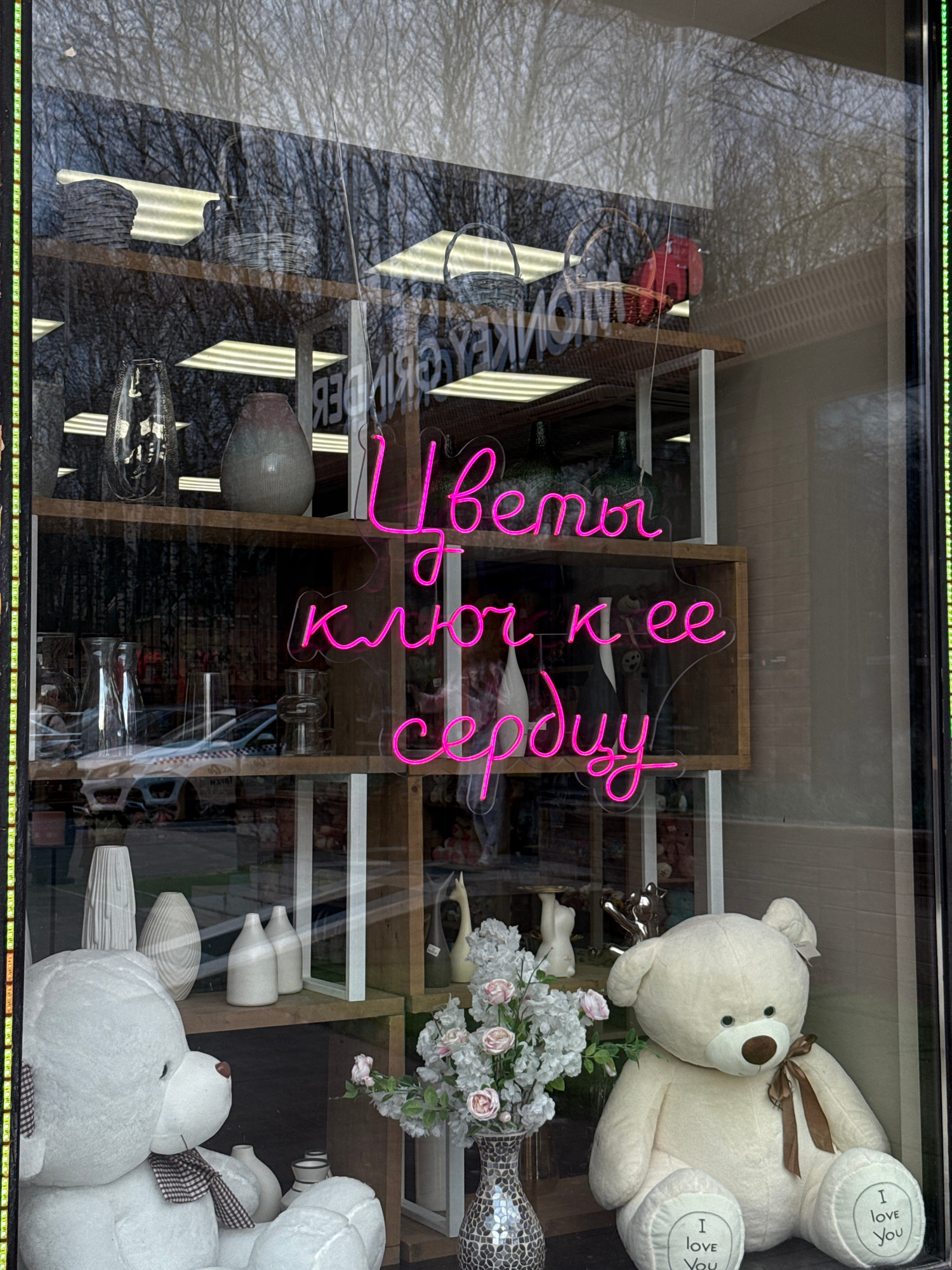 The image shows a storefront display in Perm, Russia, as evidenced by the Cyrillic script in the neon sign. The display includes shelves arranged in a rectangular configuration. On the shelves, variou…read more