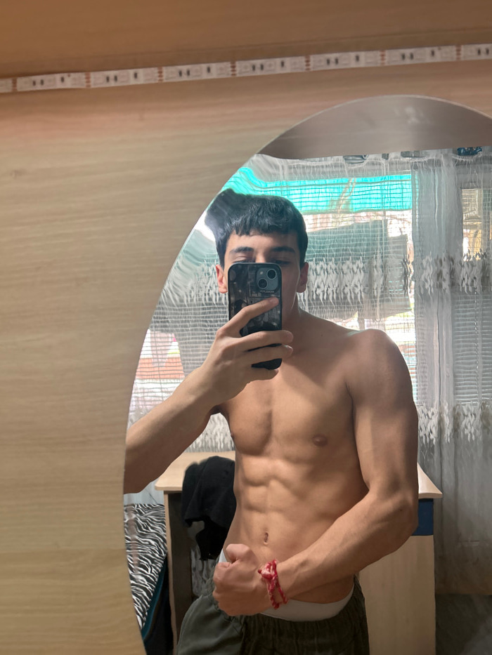 A male individual is depicted in a mirror selfie, taken indoors within a room in Pernik, Bulgaria. The subject, appearing young with dark, wavy hair, is shirtless, exposing a muscular upper torso withβ¦read more