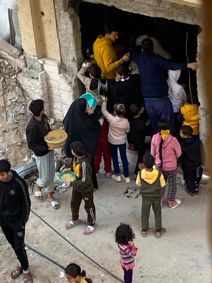 The image depicts an outdoor scene in Khan Yunis, Palestinian Territory, characterized by a gathering of people in front of a partially destroyed building. The structure on the left exhibits significa…read more