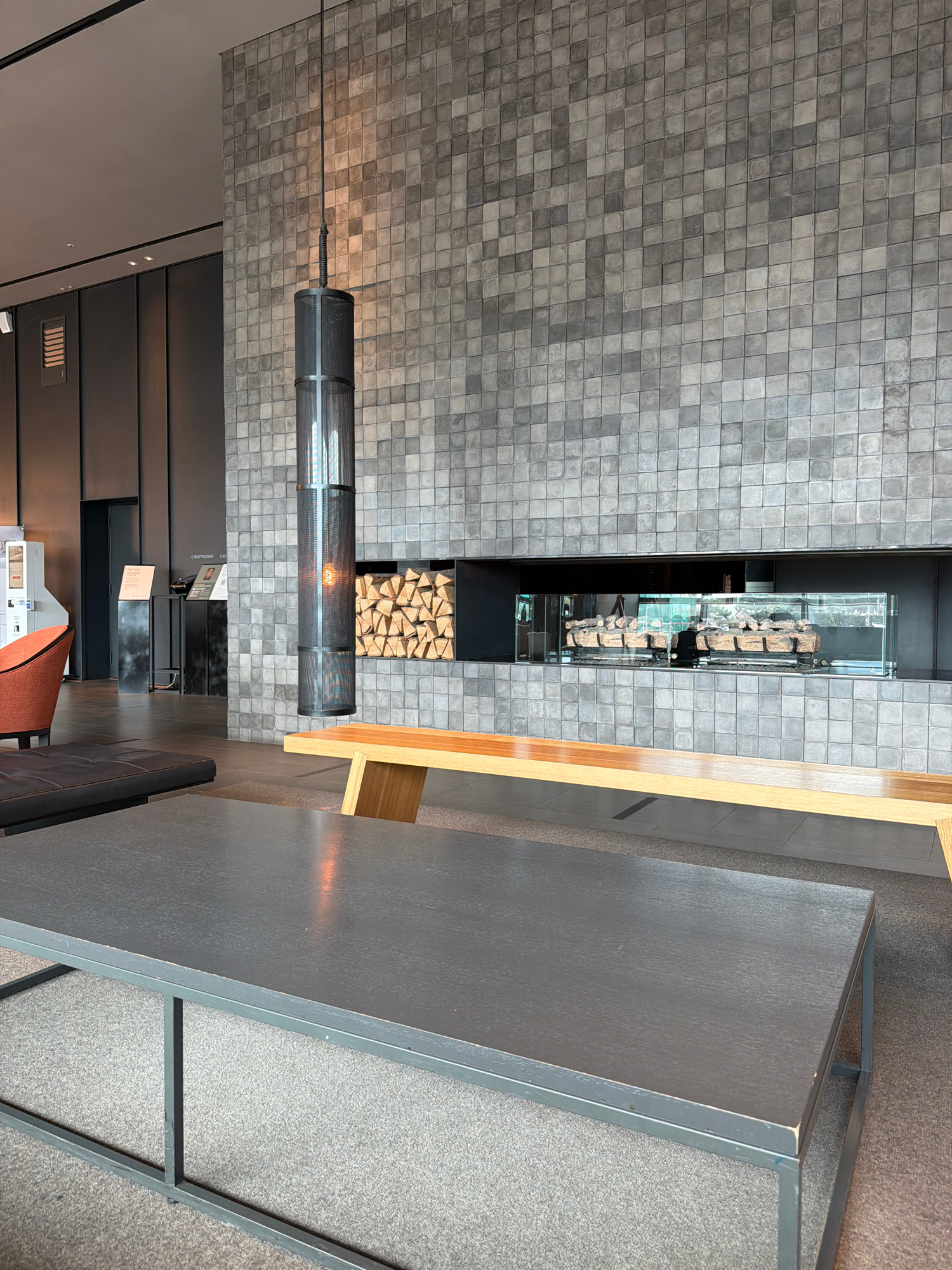 The image captures an interior space in Busan, South Korea, showcasing a modern design. A wall with gray, square-patterned tiles extends upwards, featuring a vertical, recessed display area. This sect…read more