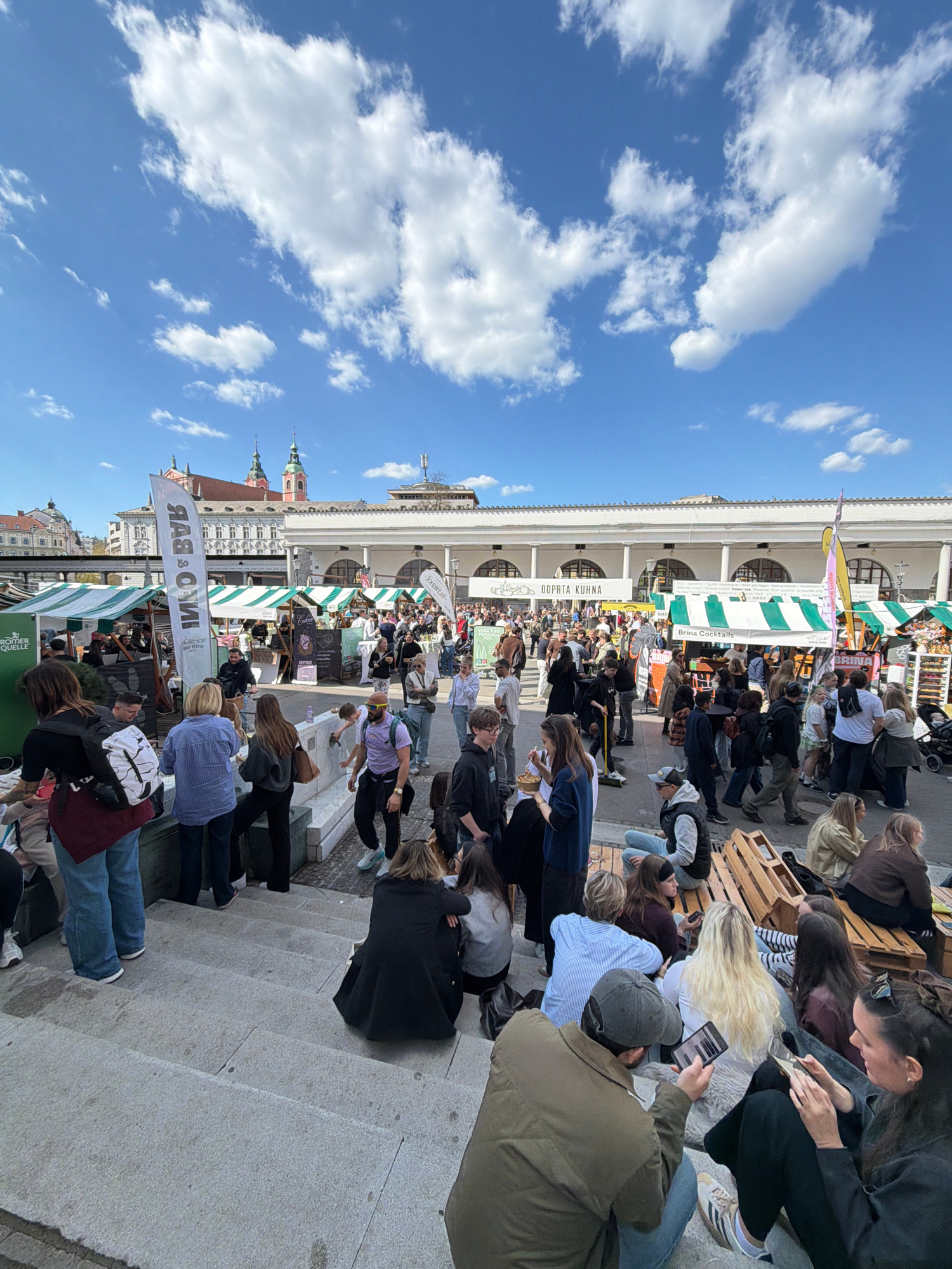 The image depicts a crowded outdoor event in Ljubljana, Slovenia, situated in front of a historic building with a colonnade and striped awnings indicating food or vendor stalls. Numerous people are seen seated on steps leading up to the building, engaging with their phones and interacting in small groups. Banners with text, one possibly reading "vino bar," are visible near the bottom of the frame. The sky is bright blue with scattered white clouds. The overall scene conveys a lively, public gathering on a sunny day in Ljubljana. | Open Wire