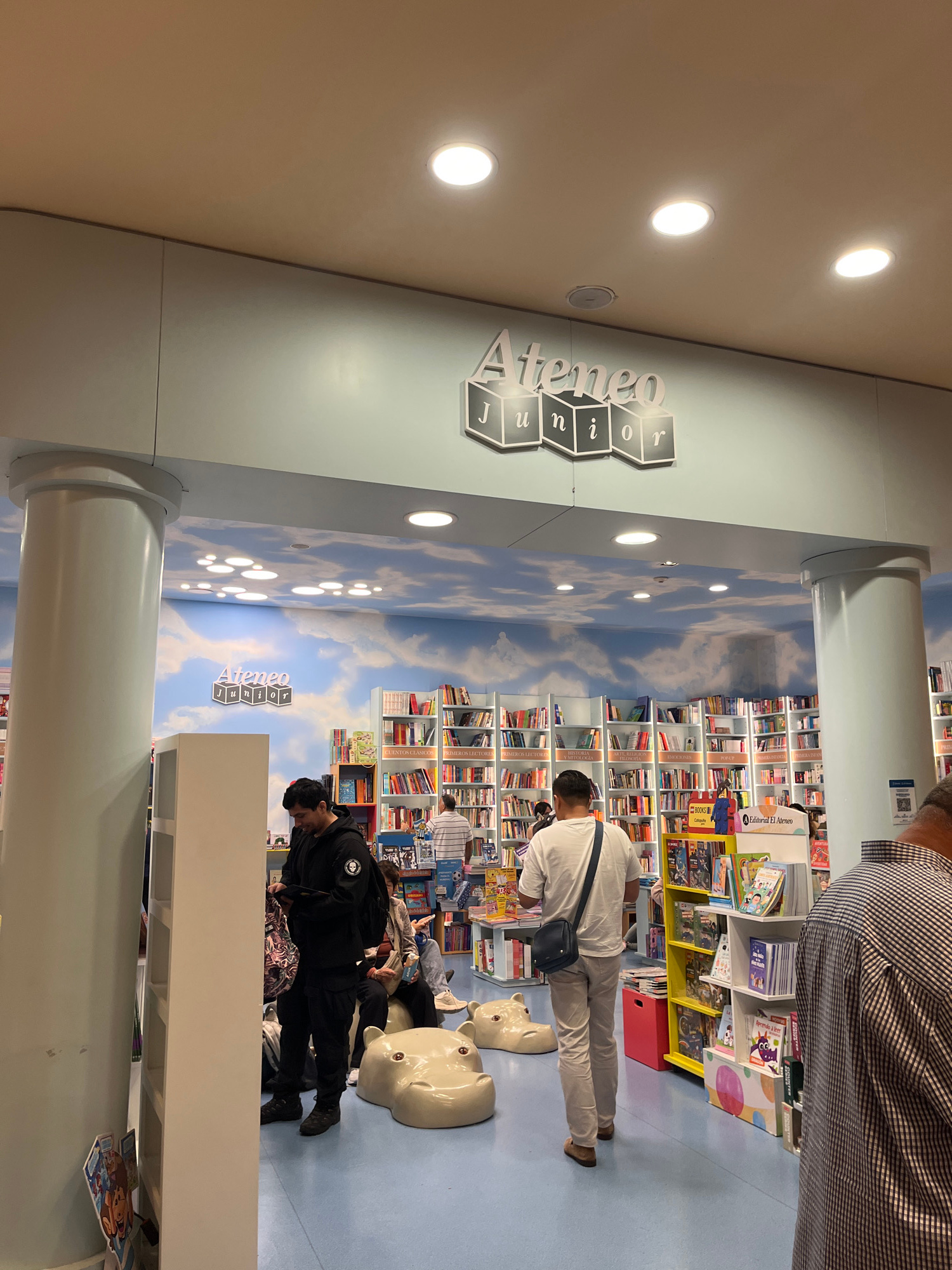 The image captures the Ateneo Junior bookstore in Buenos Aires, Argentina, featuring a vibrant interior with bookshelves filled with books. Several people are browsing the shelves. Two people are sittβ¦read more