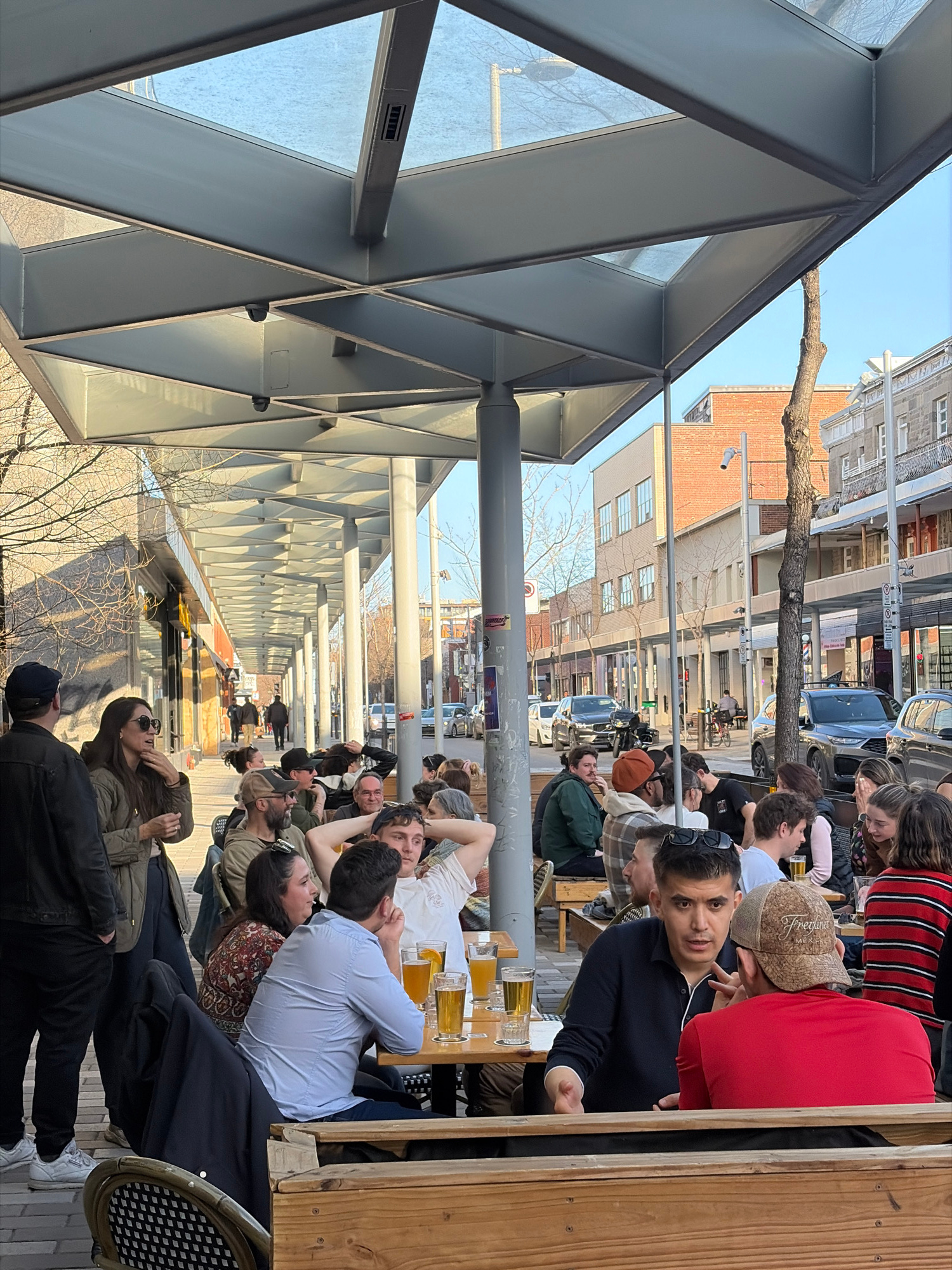 The image depicts a long outdoor patio in Montreal, Canada, filled with people seated at tables, enjoying food and drinks. The patio is covered by a modern metal and glass structure, creating a partia…read more