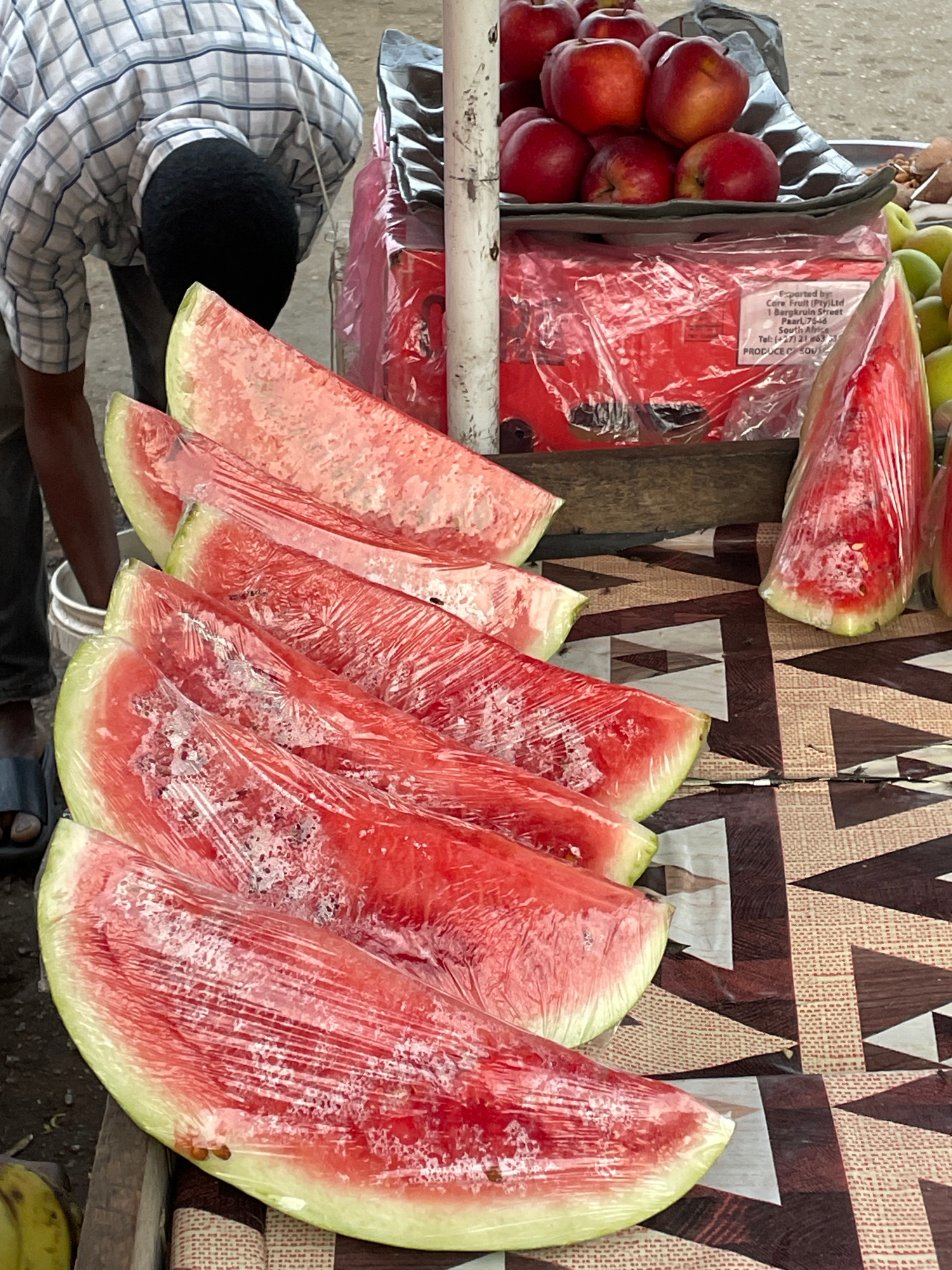 The image shows a vendor at a street market in Jos, Nigeria, selling various fruits. Red apples are stacked in a container, and slices of watermelon, individually wrapped in clear plastic, are arrange…read more