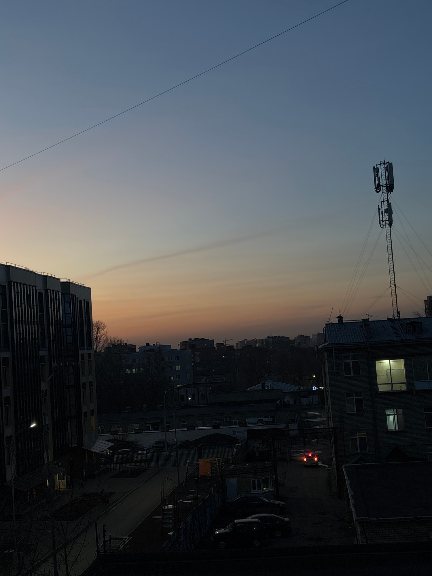 A twilight view from a high vantage point, likely a building, overlooking a cityscape. In the foreground, modern residential or commercial buildings with dark windows are visible. Further back, a dens…read more