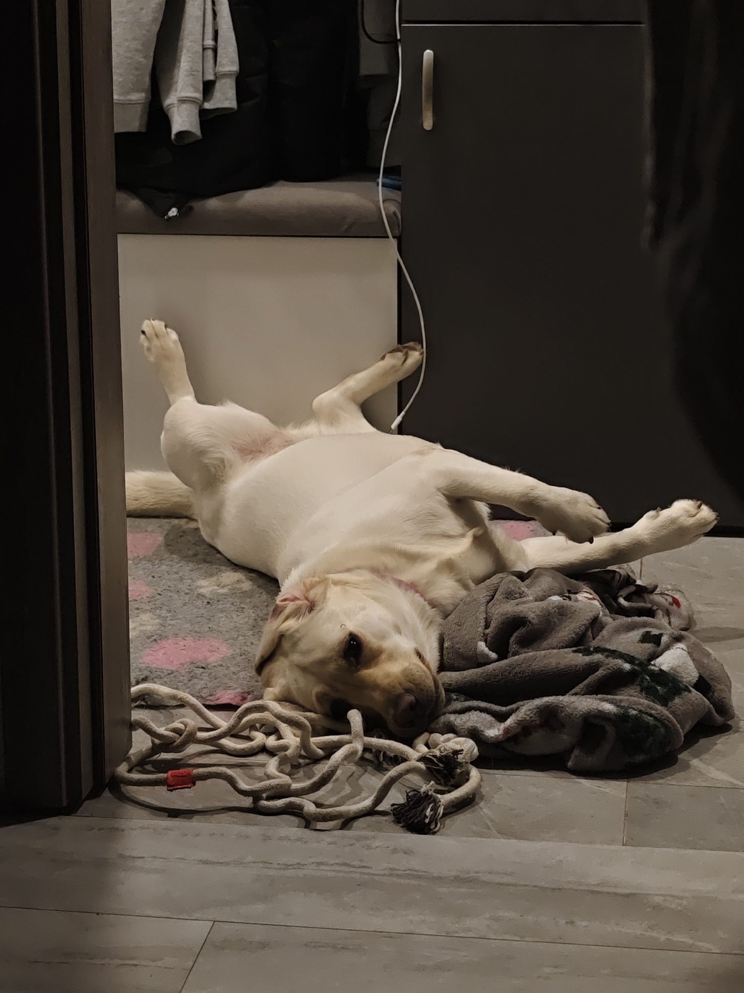 A Labrador Retriever-type dog with a pale coat is lying on its back on a gray patterned blanket. A large, twisted rope toy is near the dog's head. The dog is positioned on a tiled floor near a doorwayβ¦read more