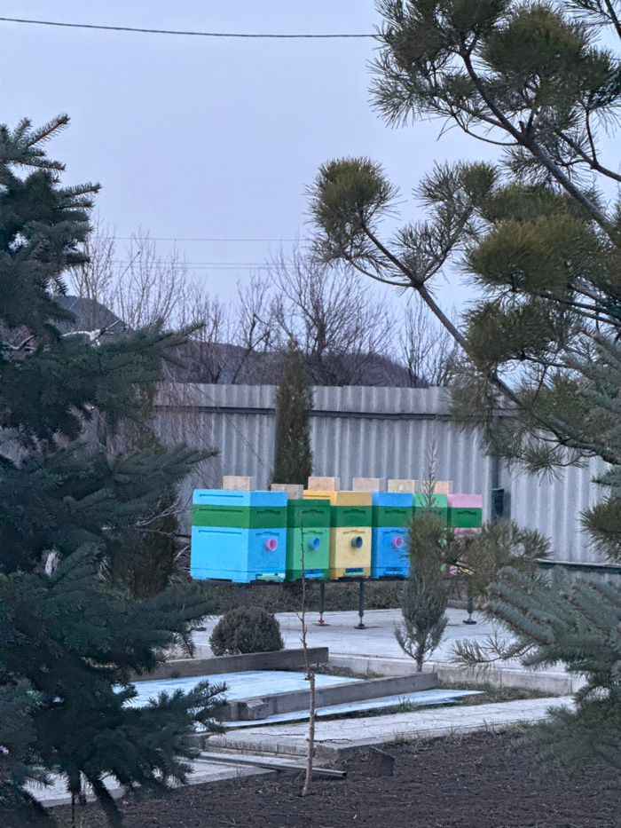 The image displays a row of eight colorful apiary beehives situated in Makiivka, Ukraine, observed through a foreground of dark green evergreen foliage. Each beehive unit is stacked two high, presenti…read more