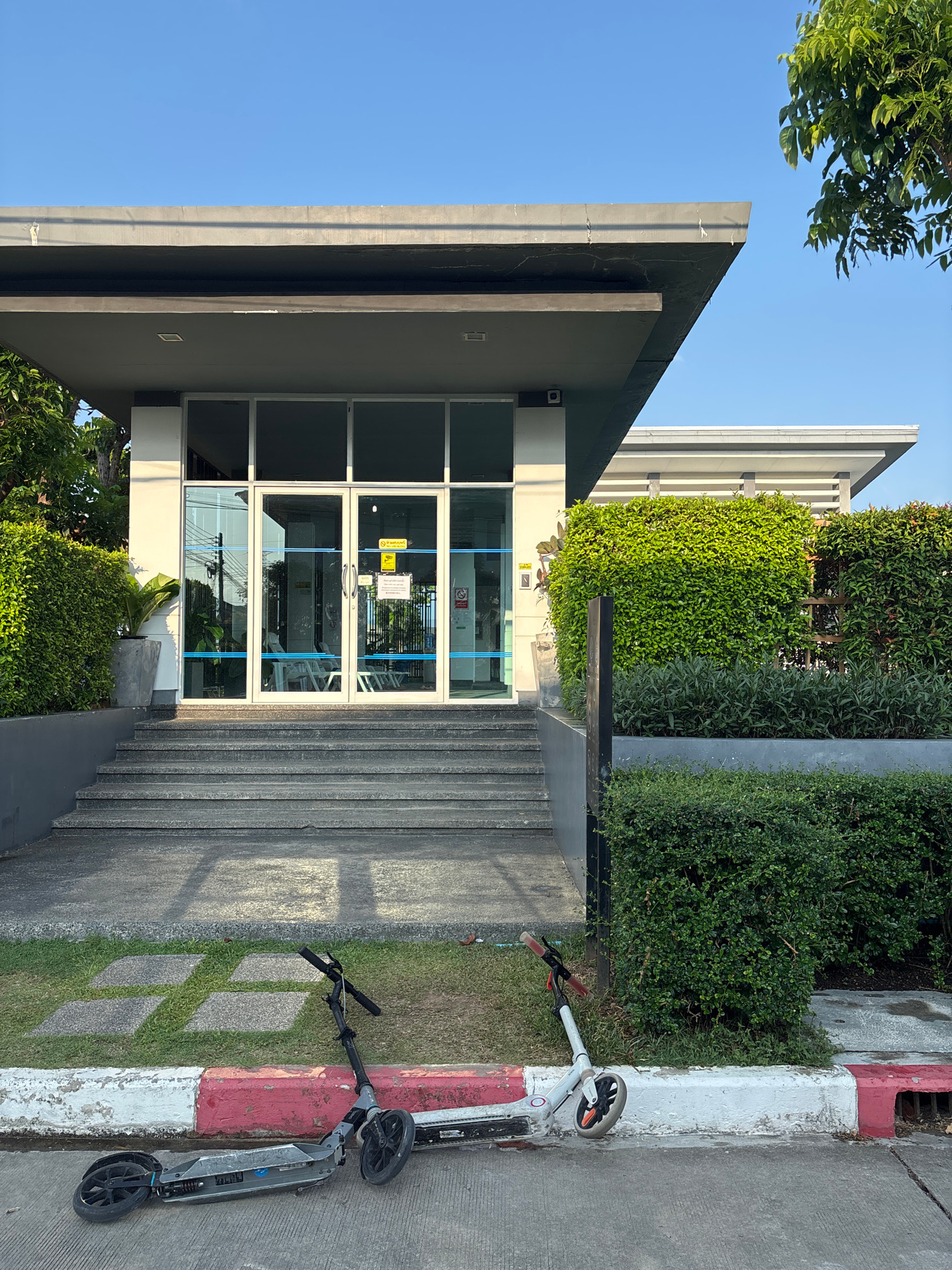The scene depicts the exterior of a building in Ko Kaeo, Thailand. The building has a modern design, featuring a grey, sharply angled roof and a glass-paneled entrance with blue trim. There are steps…read more