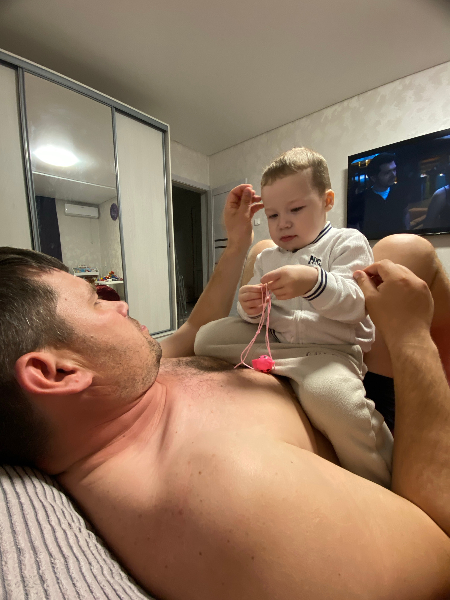 A man is lying on his back in a room. A young child is sitting on his chest, holding a pink object with strings. A television is visible in the background, and a mirrored sliding-door wardrobe is agai…read more