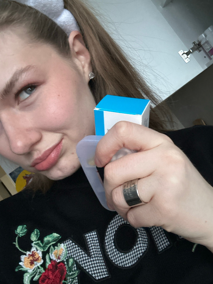 A woman is holding a light purple dispenser to her chin. The dispenser contains a small, round yellow object. A blue and white box sits next to the dispenser. The woman is wearing a silver ring with t…read more