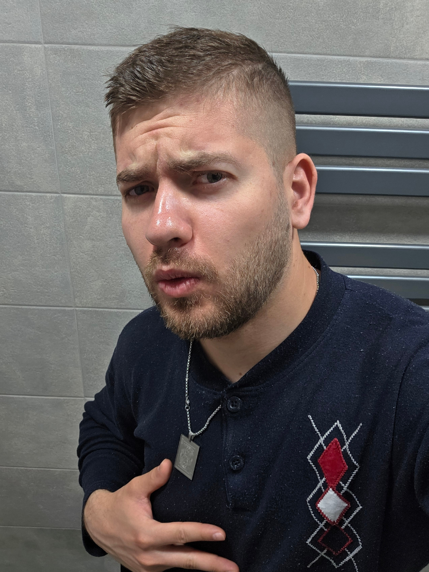 A man with short, dark hair and a beard is shown in a selfie-style shot. He is wearing a dark blue, long-sleeved shirt with a white and red diamond pattern on the left side. A silver chain with a rect…read more