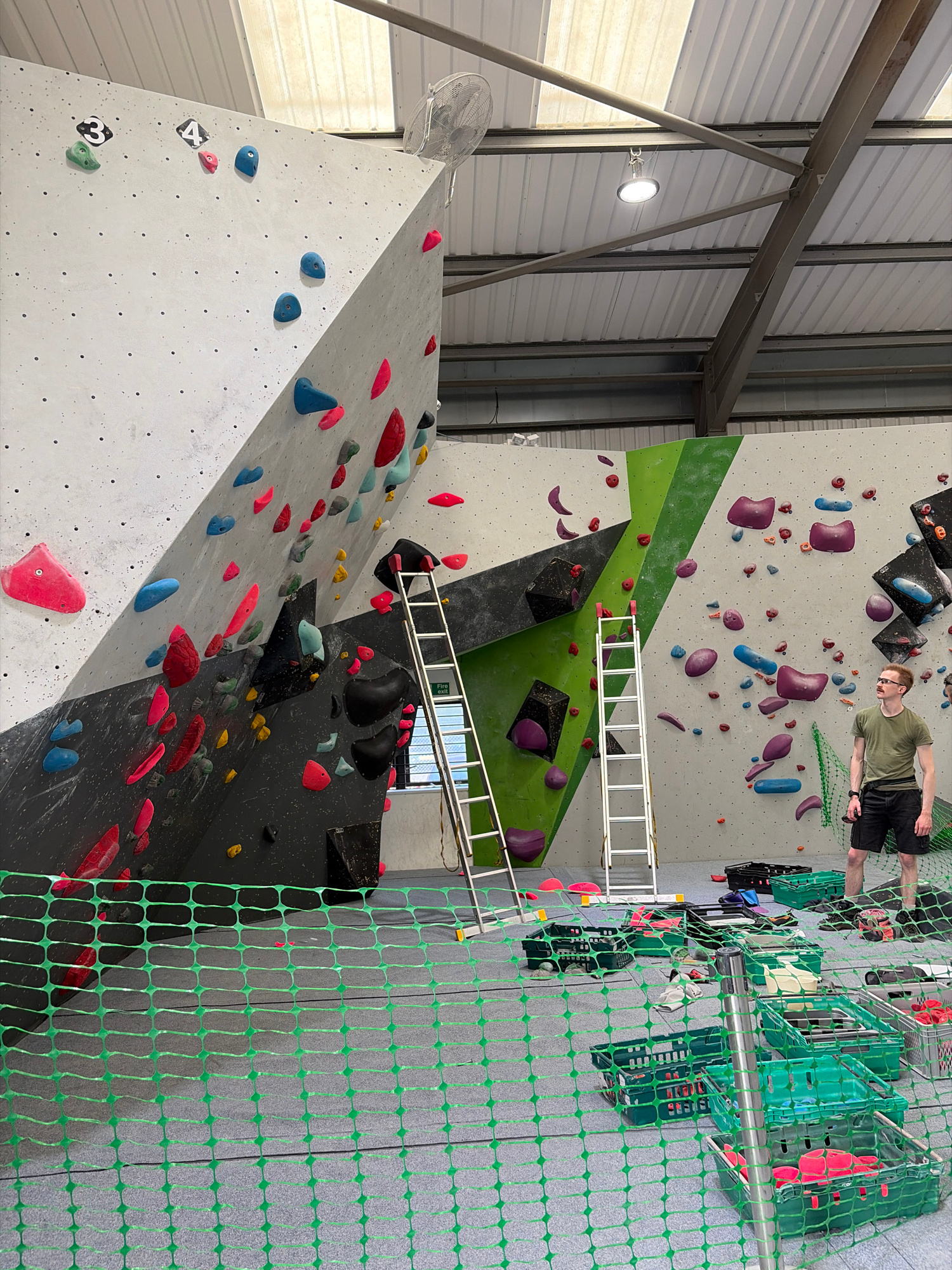 The image shows an indoor climbing gym in Ipswich, United Kingdom. The gym features a variety of climbing walls with different angles and holds of various shapes and colors. A man is standing on top o…read more