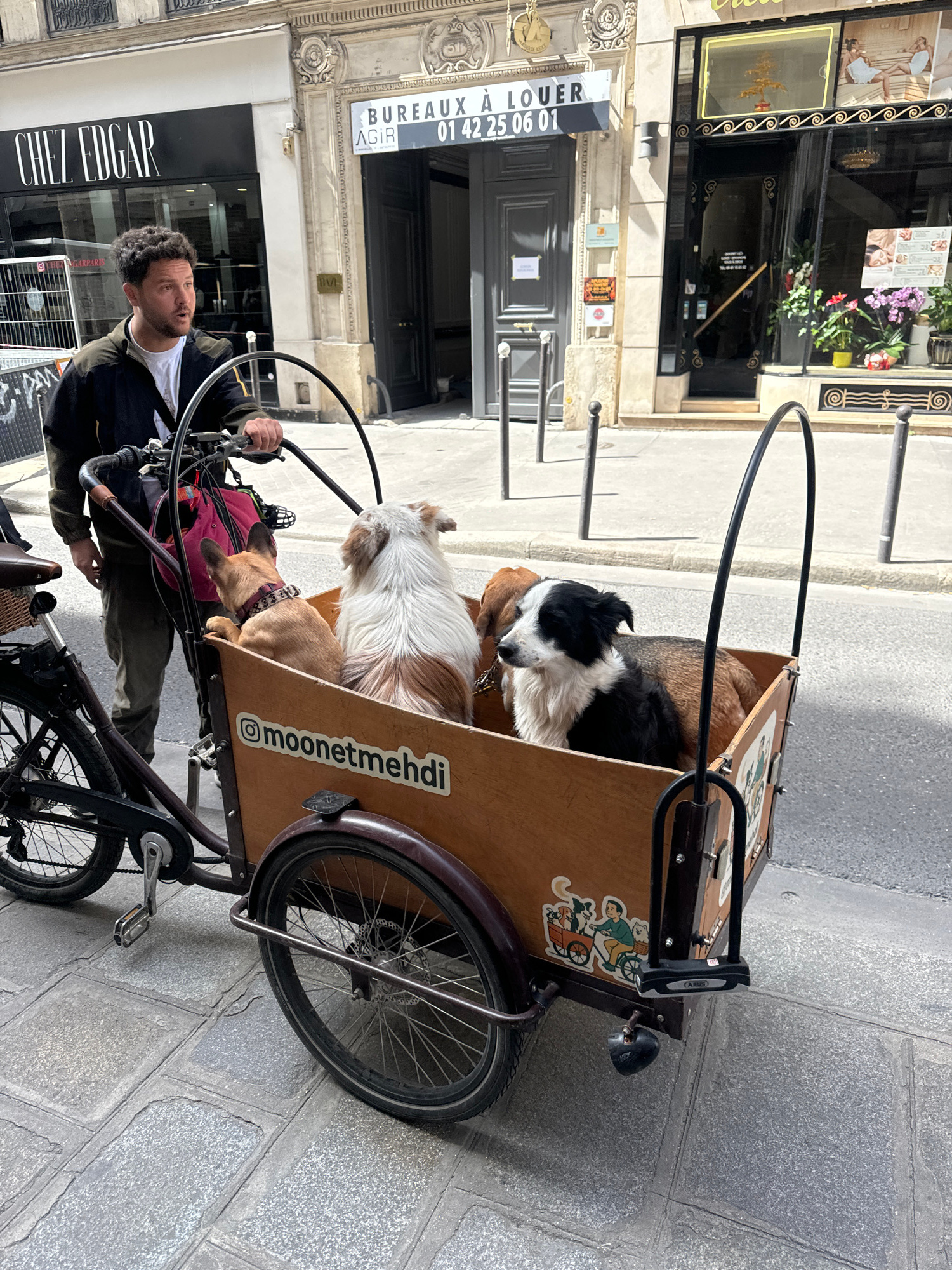 A man is depicted walking alongside a wooden cargo bicycle on a sunny city street, transporting several dogs. The man, with dark curly hair and a beard, is wearing a dark jacket over a white t-shirt a…read more