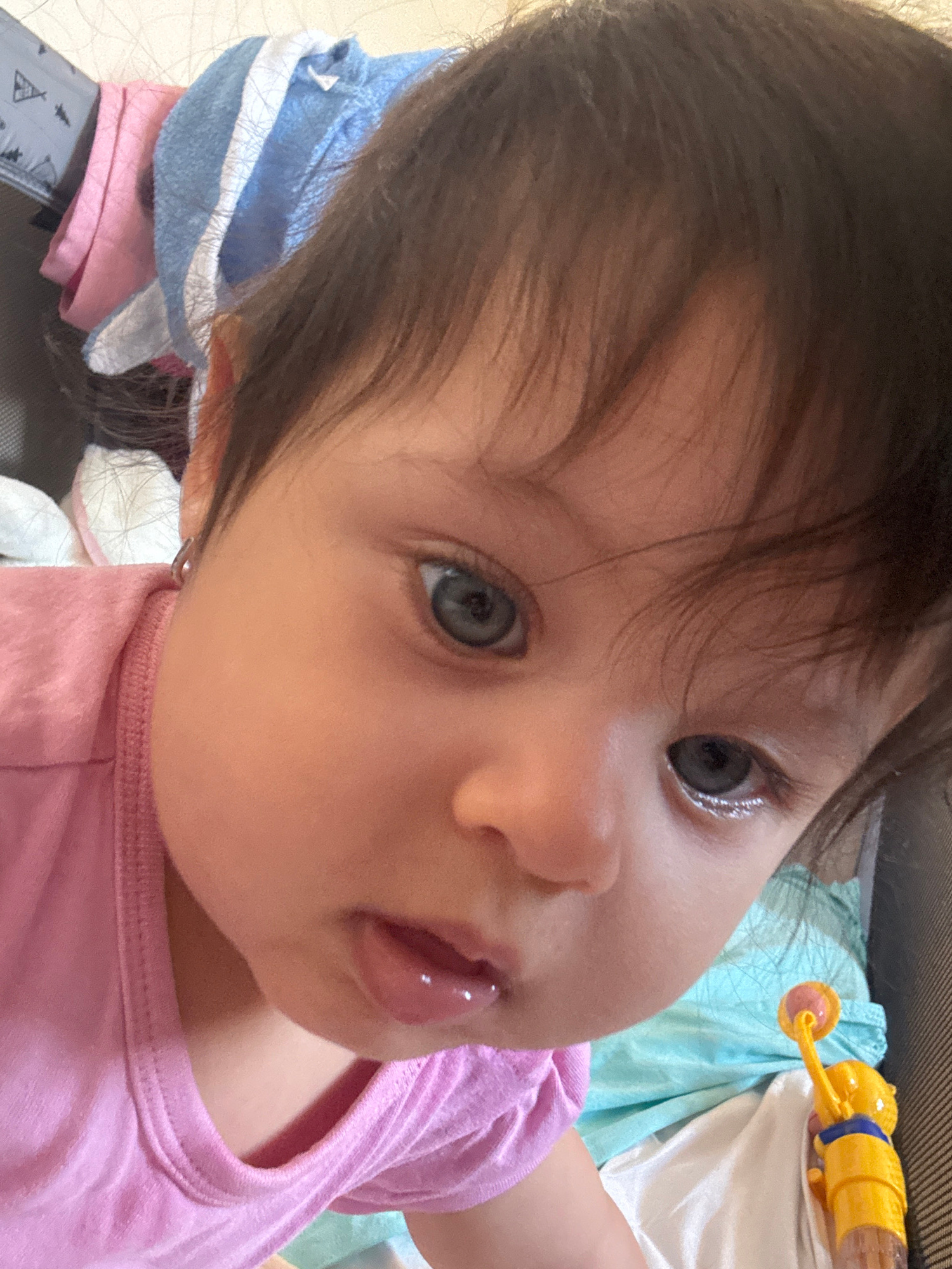 A close-up photograph shows a baby girl with dark brown hair and blue eyes. She is wearing a pink shirt. Her tongue is slightly protruding. Behind her, there is a yellow toy and what appears to be a l…read more